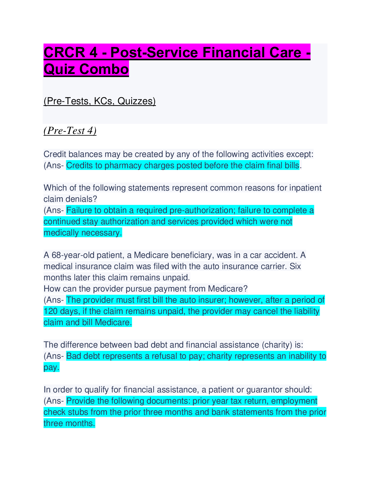 Health Care> EXAM > CRCR 4 - Post-Service Financial Care - Quiz Combo: (Pre-Tests, KCs, Quizzes): Solved: Questions & Answers (All)