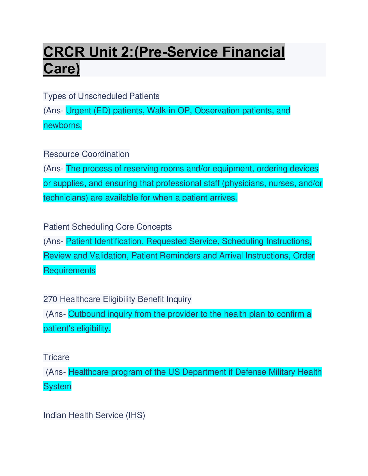 Health Care> EXAM > CRCR Unit 2:(Pre-Service Financial Care): Latest Updated Guide (All)