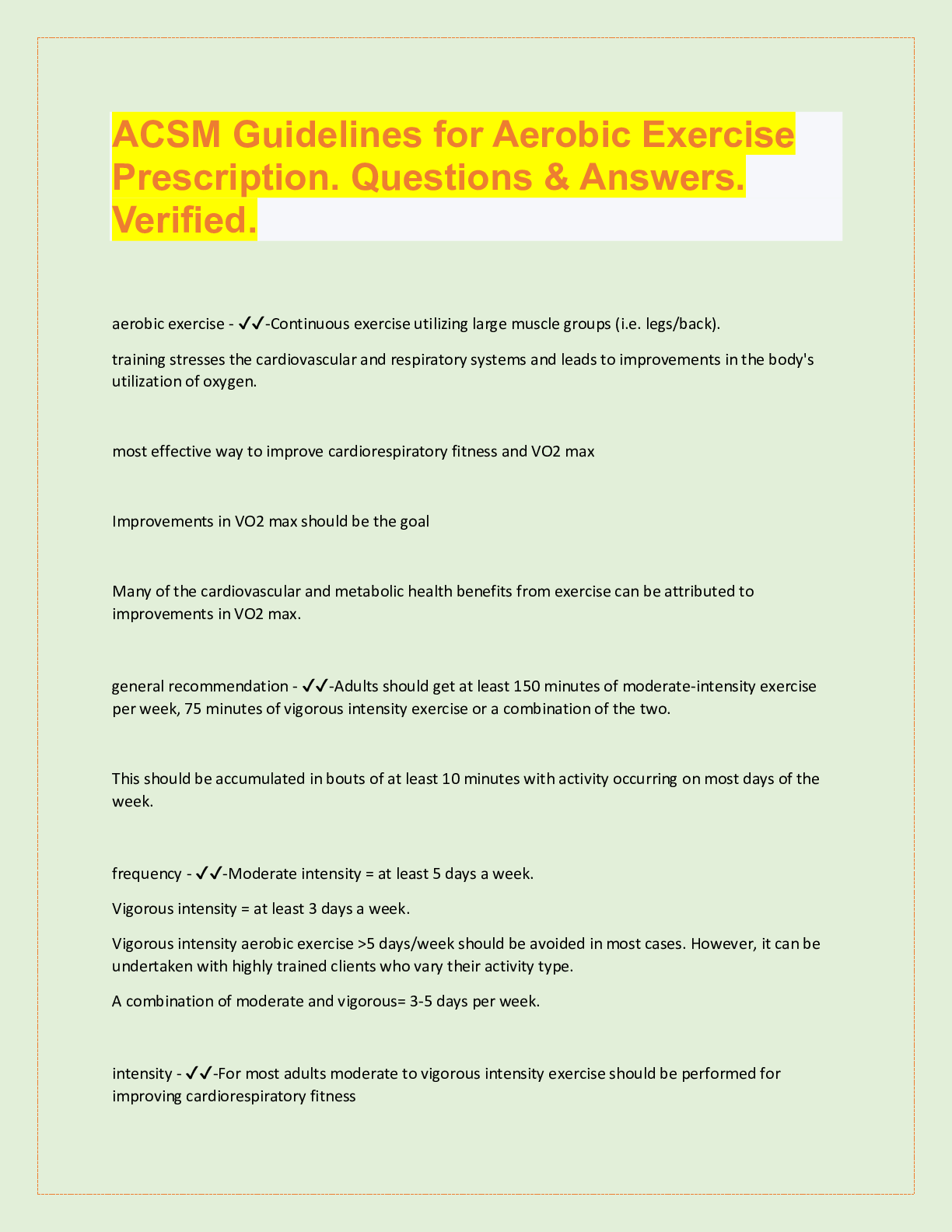 *NURSING> QUESTIONS & ANSWERS > ACSM Guidelines for Aerobic Exercise Prescription. Questions & Answers. Verified. (All)