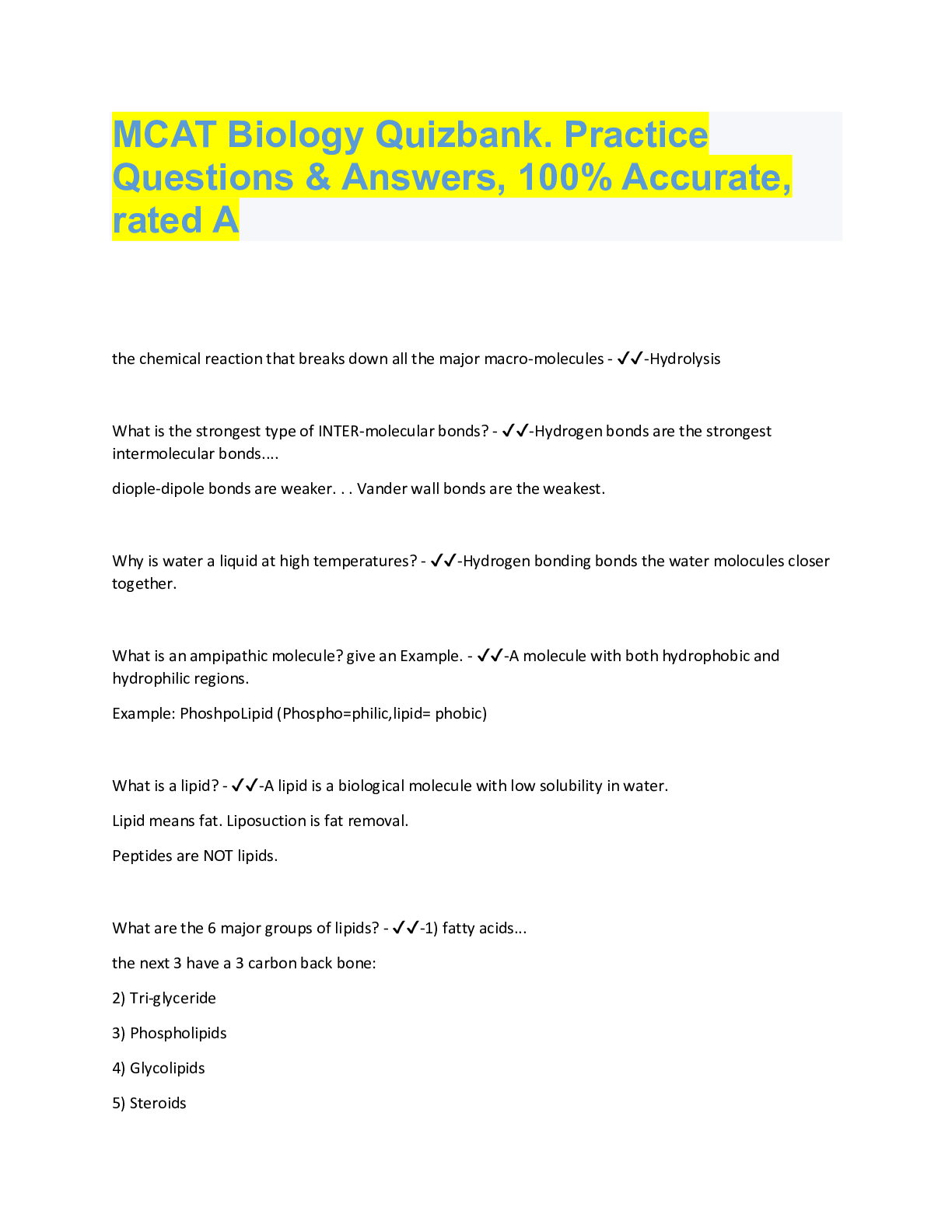 MCAT Biology Quizbank. Practice Questions & Answers, 100% Accurate, rated A the chemical reaction that breaks down all the major macro-molecules - ✔✔-Hydrolysis What is the strongest type of INT...