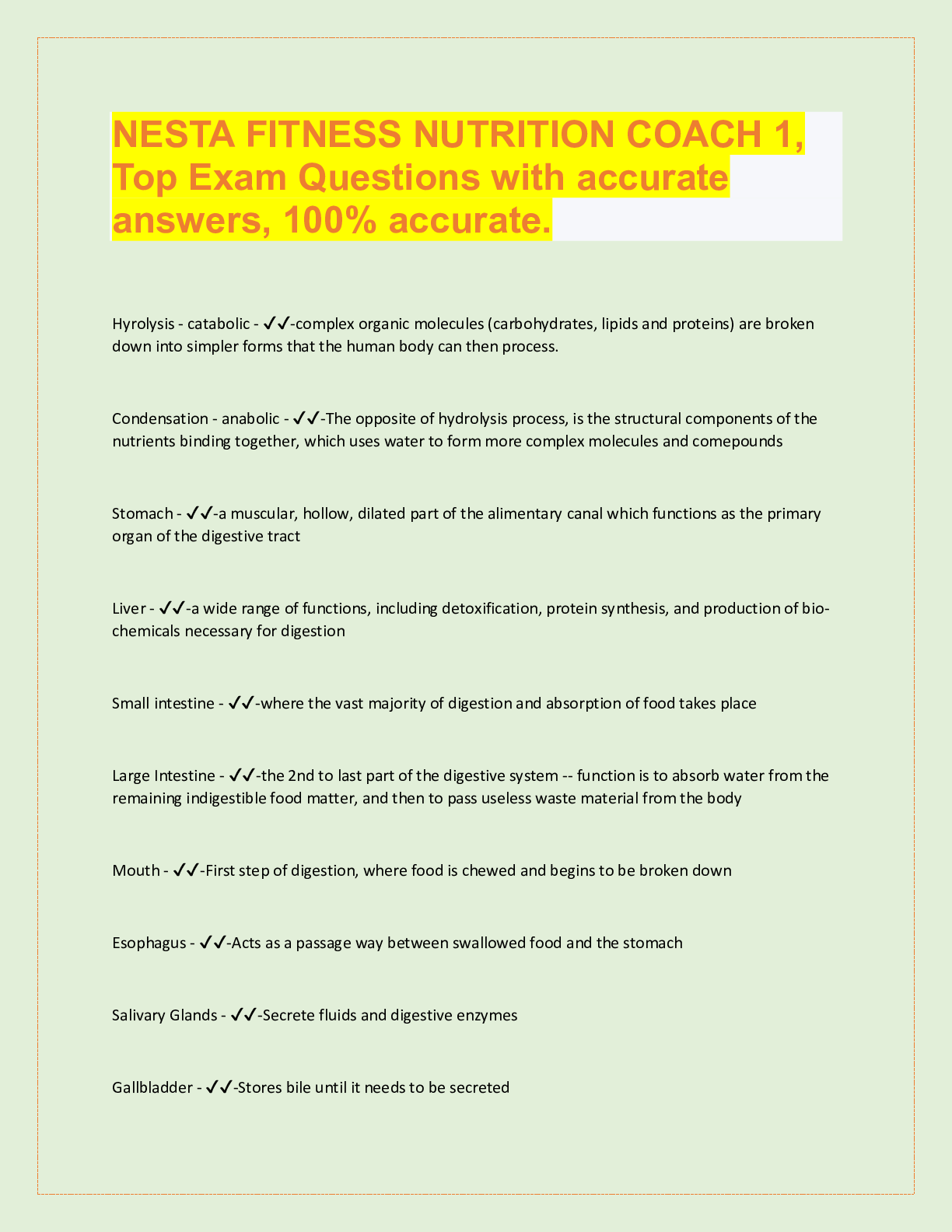 NESTA FITNESS NUTRITION COACH 1, Top Exam Questions with accurate answers, 100% accurate. Hyrolysis - catabolic - ✔✔-complex organic molecules (carbohydrates, lipids and proteins) are broken do...