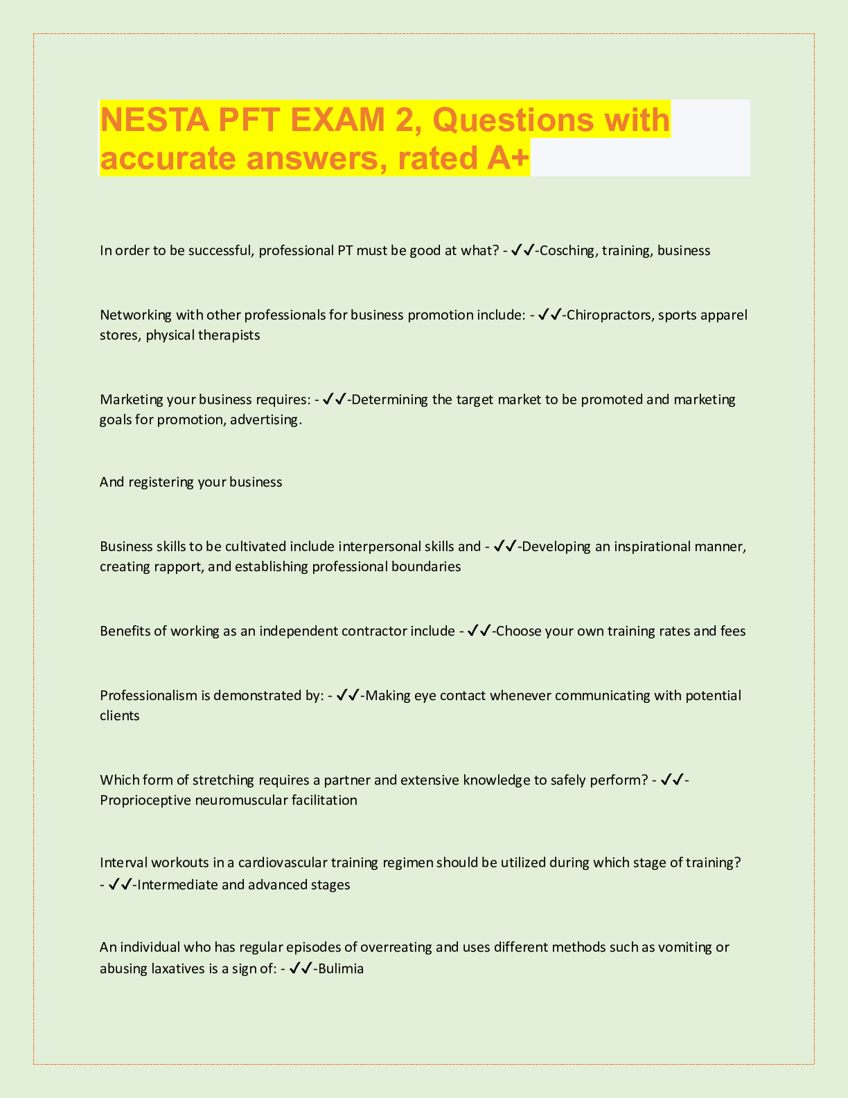 NESTA PFT EXAM 2, Questions with accurate answers, rated A+ In order to be successful, professional PT must be good at what? - ✔✔-Cosching, training, business Networking with other professionals f...
