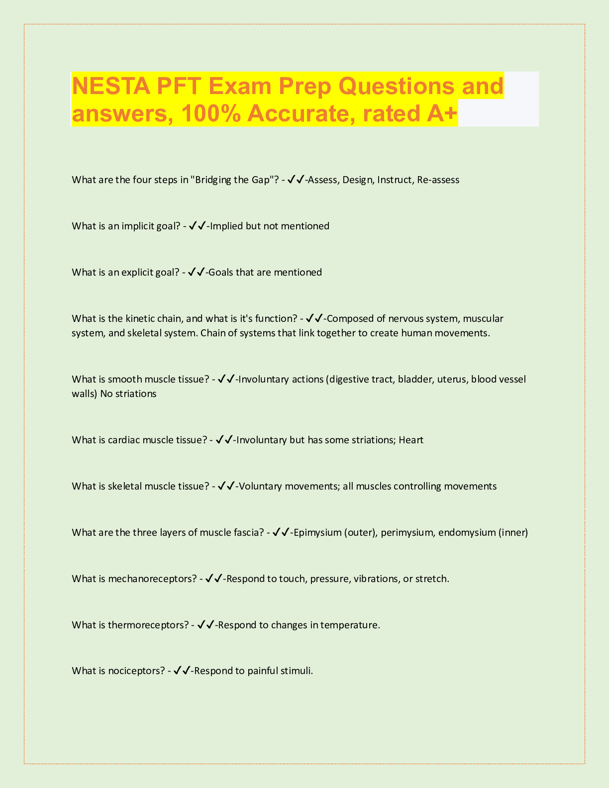 NESTA PFT Exam Prep Questions and answers, 100% Accurate, rated A+ What are the four steps in "Bridging the Gap"? - ✔✔-Assess, Design, Instruct, Re-assess What is an implicit goal? - ✔✔-Implied bu...
