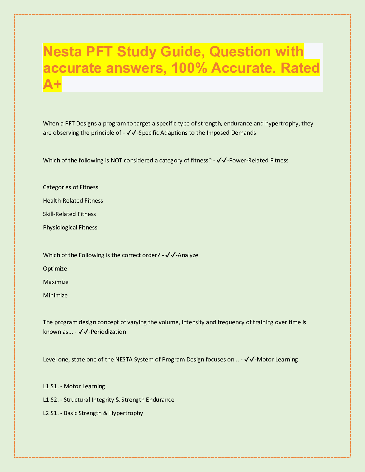 *NURSING> QUESTIONS & ANSWERS > Nesta PFT Study Guide, Question with accurate answers, 100% Accurate. Rated A+ (All)