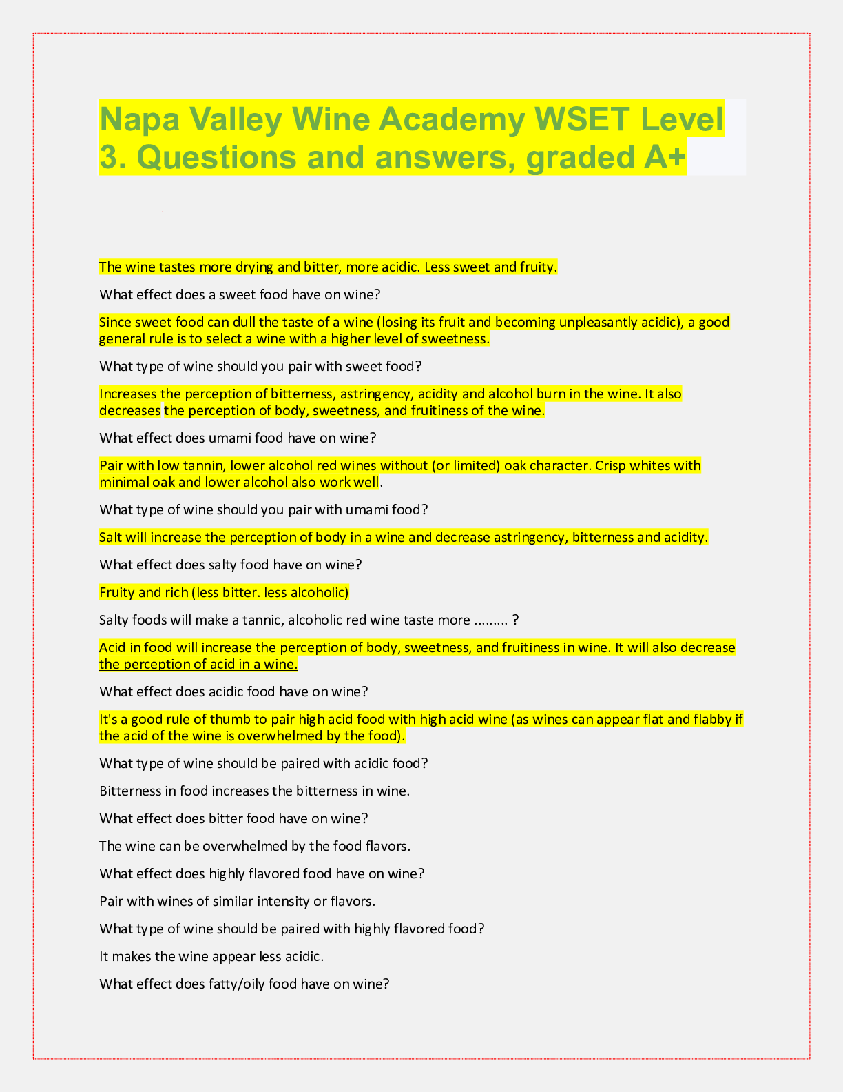 Napa Valley Wine Academy WSET Level 3. Questions and answers, graded A+ The wine tastes more drying and bitter, more acidic. Less sweet and fruity. What effect does a sweet food have on wine? Sin...