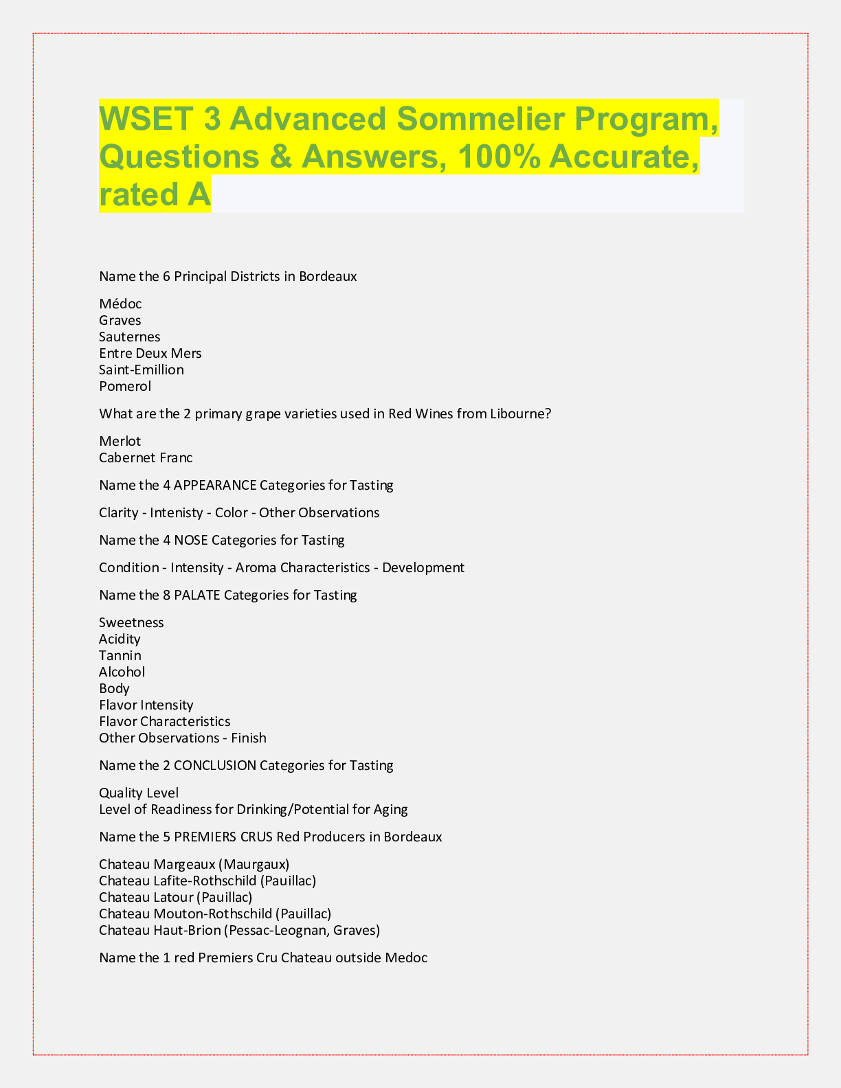 WSET 3 Advanced Sommelier Program, Questions & Answers, 100% Accurate, rated A Name the 6 Principal Districts in Bordeaux Médoc Graves Sauternes Entre Deux Mers Saint-Emillion Pomerol What...