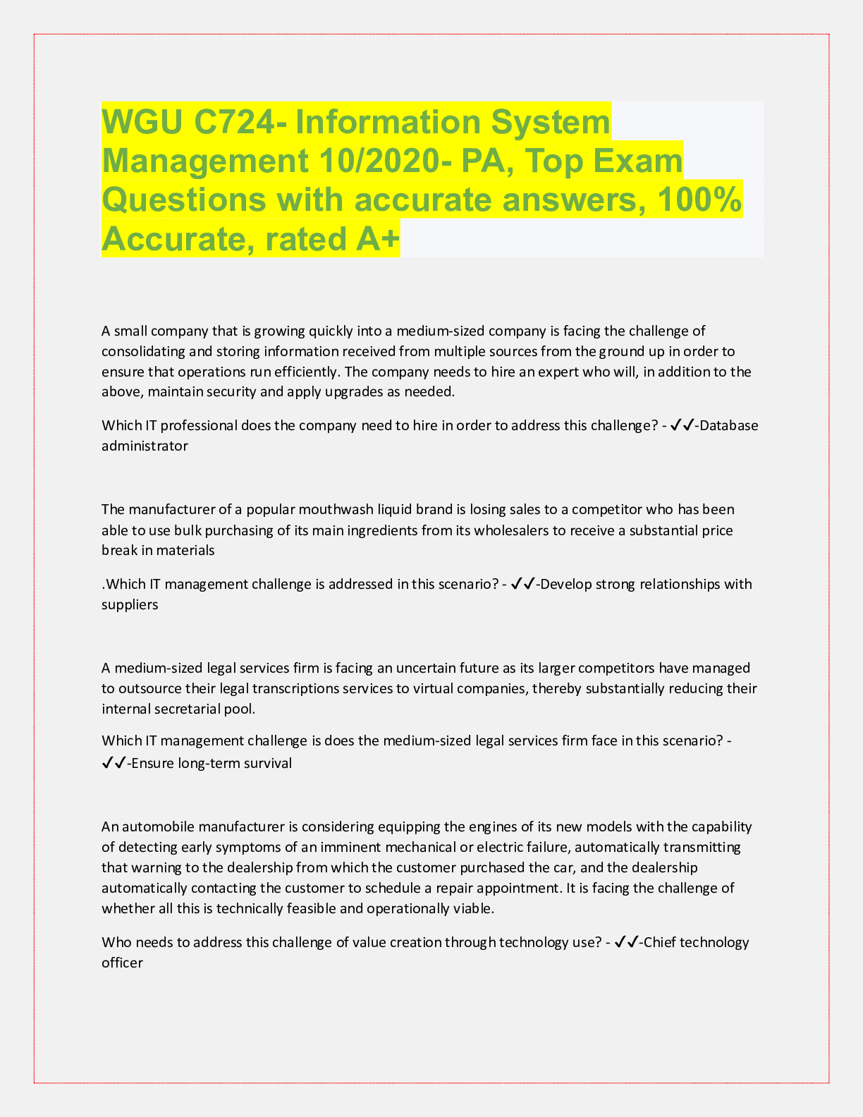 Management> QUESTIONS & ANSWERS > WGU C724- Information System Management 10/2020- PA, Top Exam Questions with accurate answers, 100% Accurate, rated A+ (All)