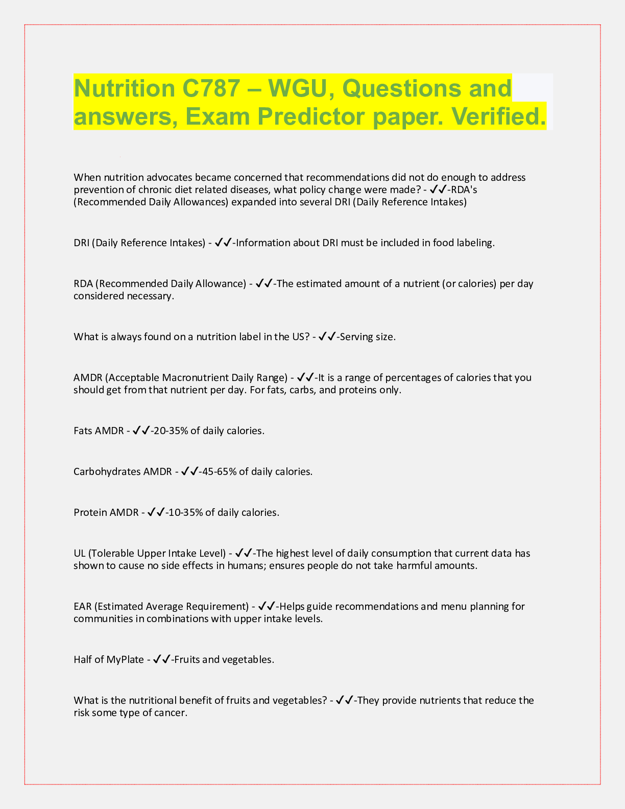 Nutrition> QUESTIONS & ANSWERS > Nutrition C787 – WGU, Questions and answers, Exam Predictor paper. Verified. (All)