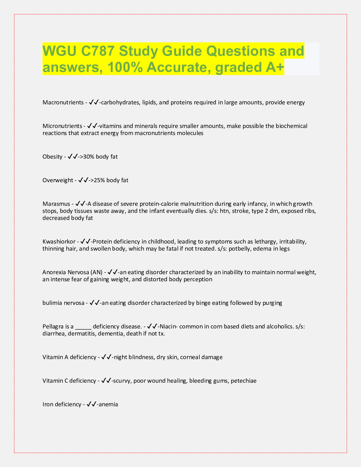 Nutrition> QUESTIONS & ANSWERS > WGU C787 Nutrition Review Questions and Notes, Questions and answers, 100% Accurate, rated A+ (All)