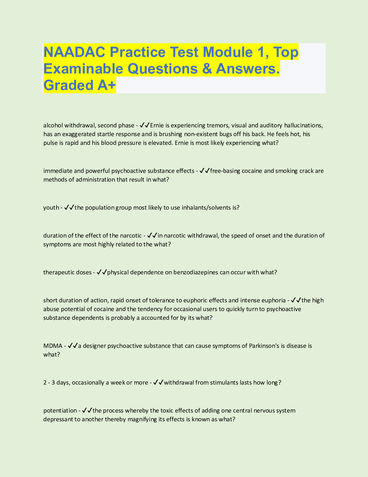 NAADAC Testing: Module 1 Top Examinable Questions with accurate answers. Rated A Uppers - ✔✔-CNS Stimulants: cocaine, amphetamines & meth, caffeine, nicotine Downers - ✔✔-CNS Depressants: alcoho...