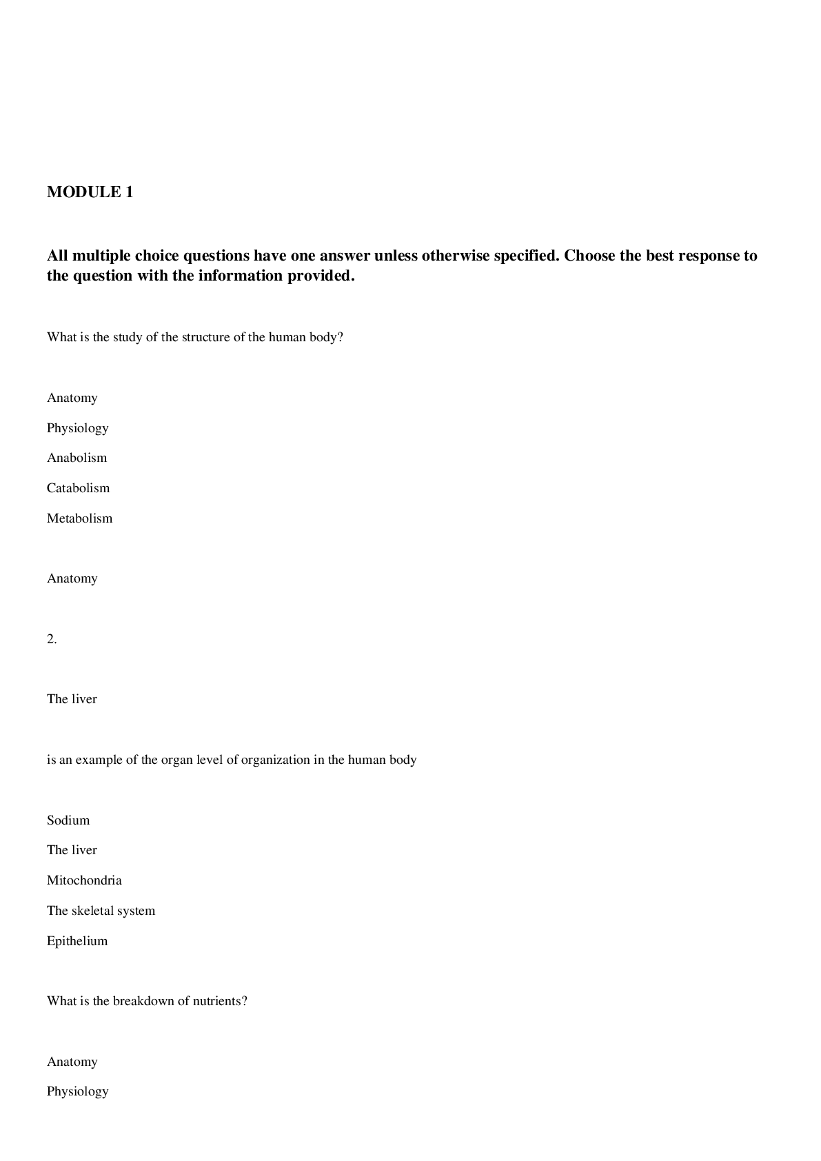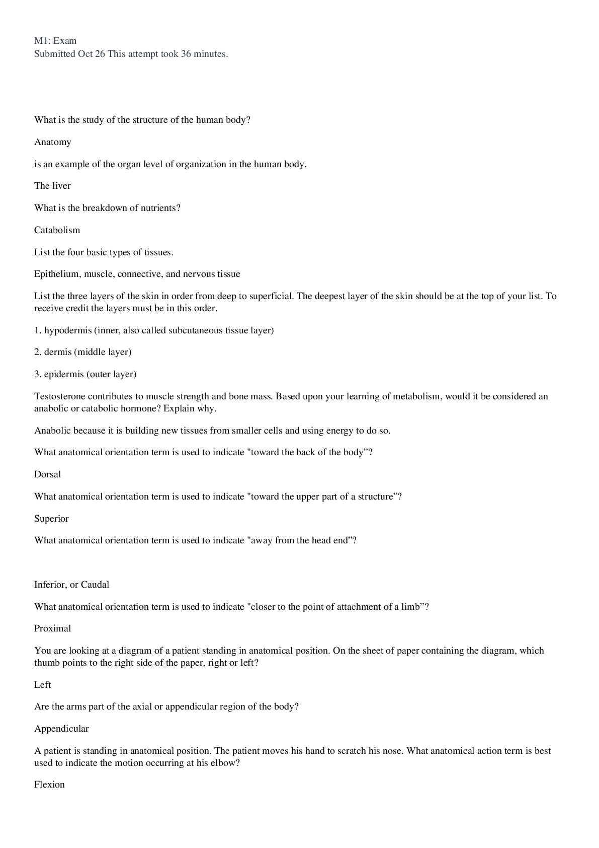 Question 1 3 / 3 pts What is the study of the structure of the human body? Correct! Anatomy Physiology Anabolism Catabolism Metabolism Question 2 4 / 4 pts Epithelium is an example of what level of or...