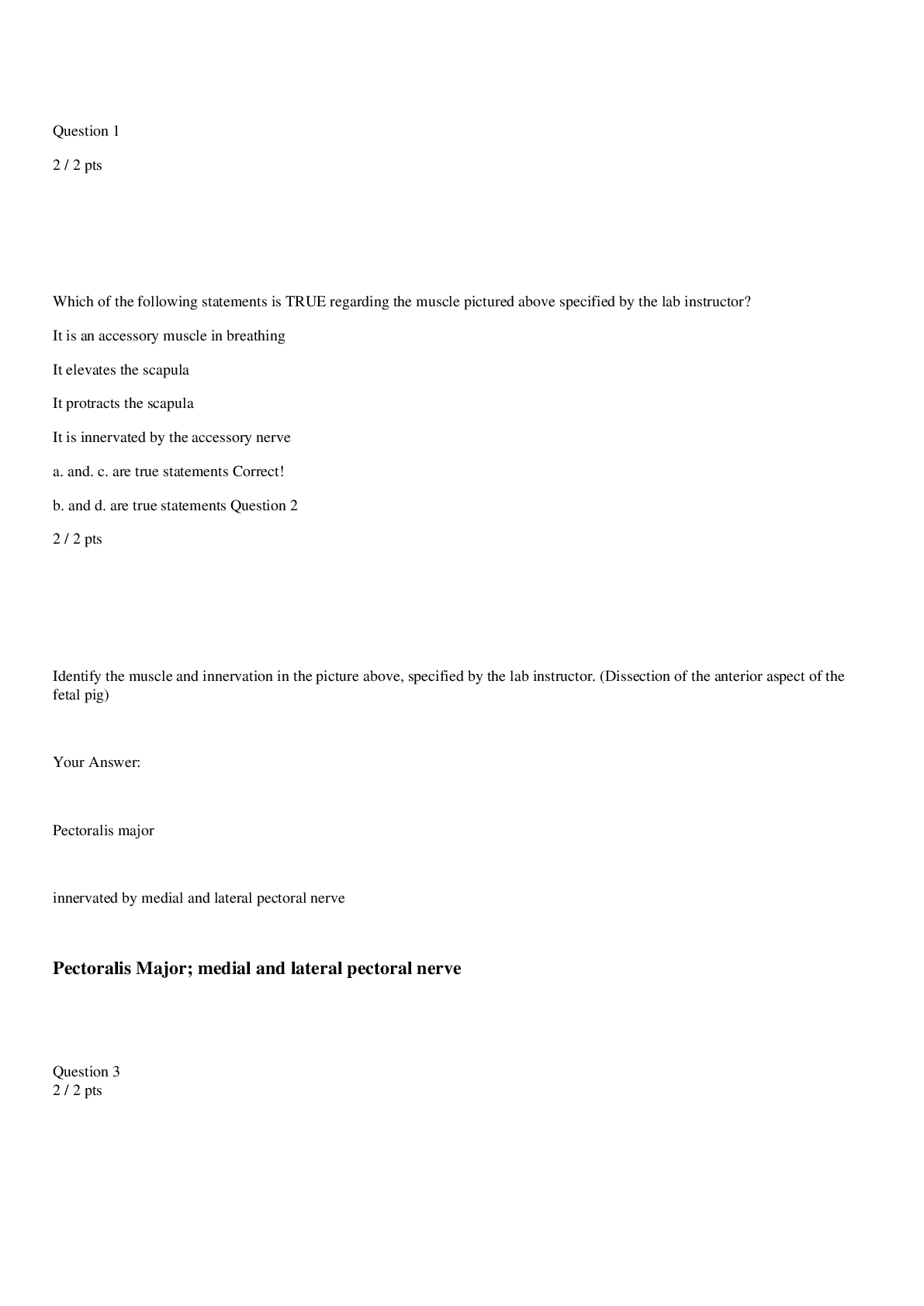 Question 1 2 / 2 pts Which of the following statements is TRUE regarding the muscle pictured above specified by the lab instructor? a. It is an accessory muscle in breathing b. It elevates the scapula...