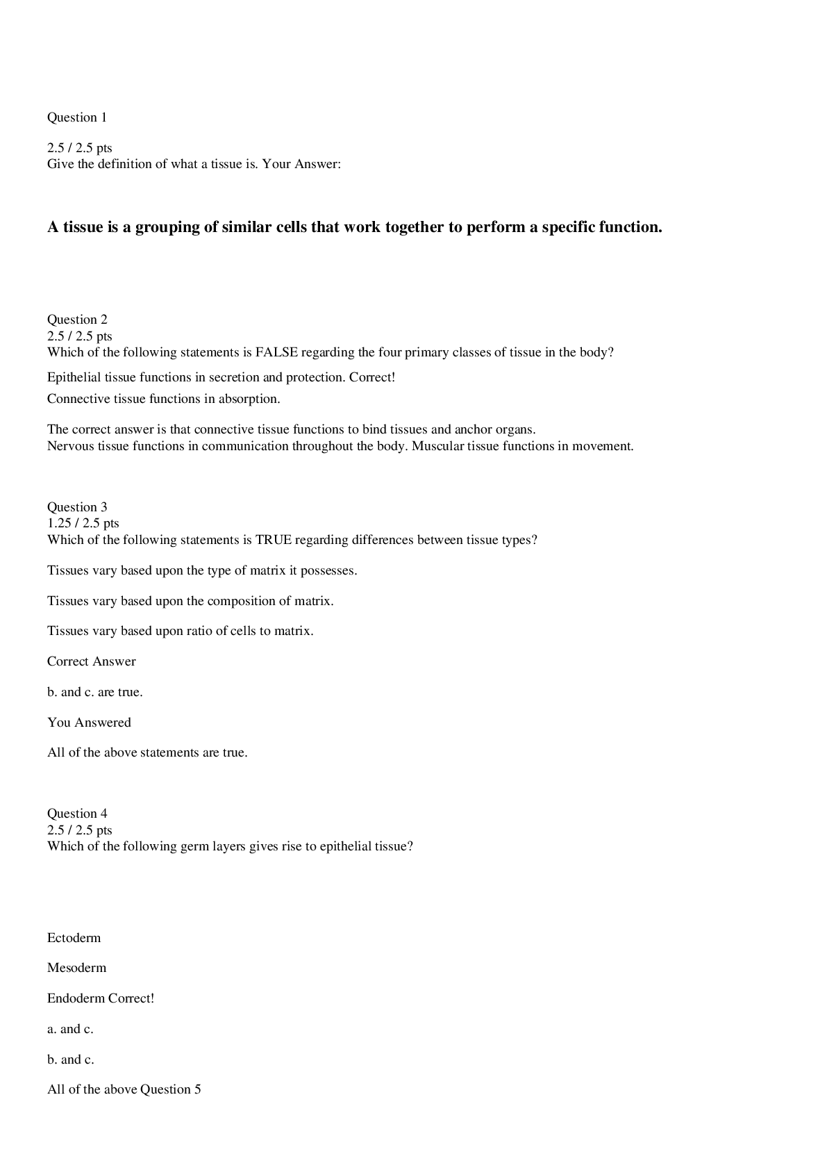 Question 1 2.5 / 2.5 pts Give the definition of what a tissue is. Your Answer: A tissue is a grouping of similar cells that work together to perform a specific function. Question 2 2.5 / 2.5 pts Which...