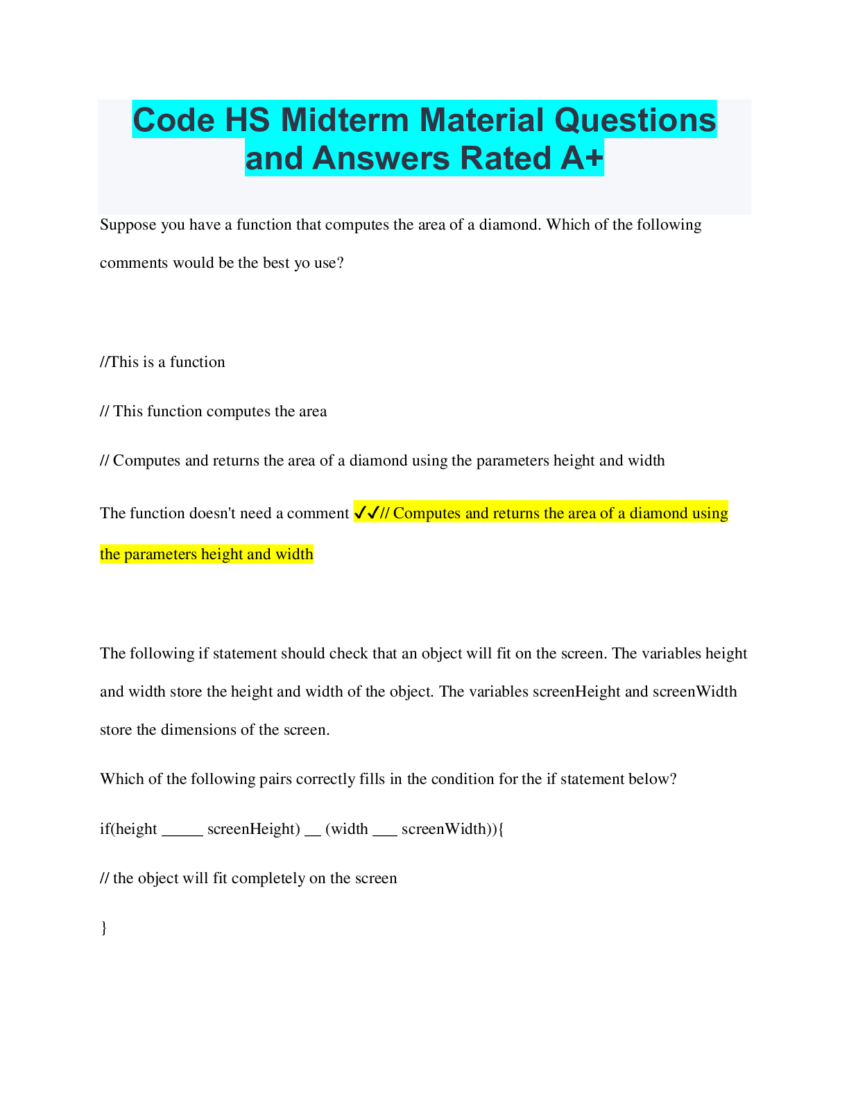 Code HS Midterm Material Questions and Answers Rated A+ Suppose you have a function that computes the area of a diamond. Which of the following comments would be the best yo use? //This is a funct...