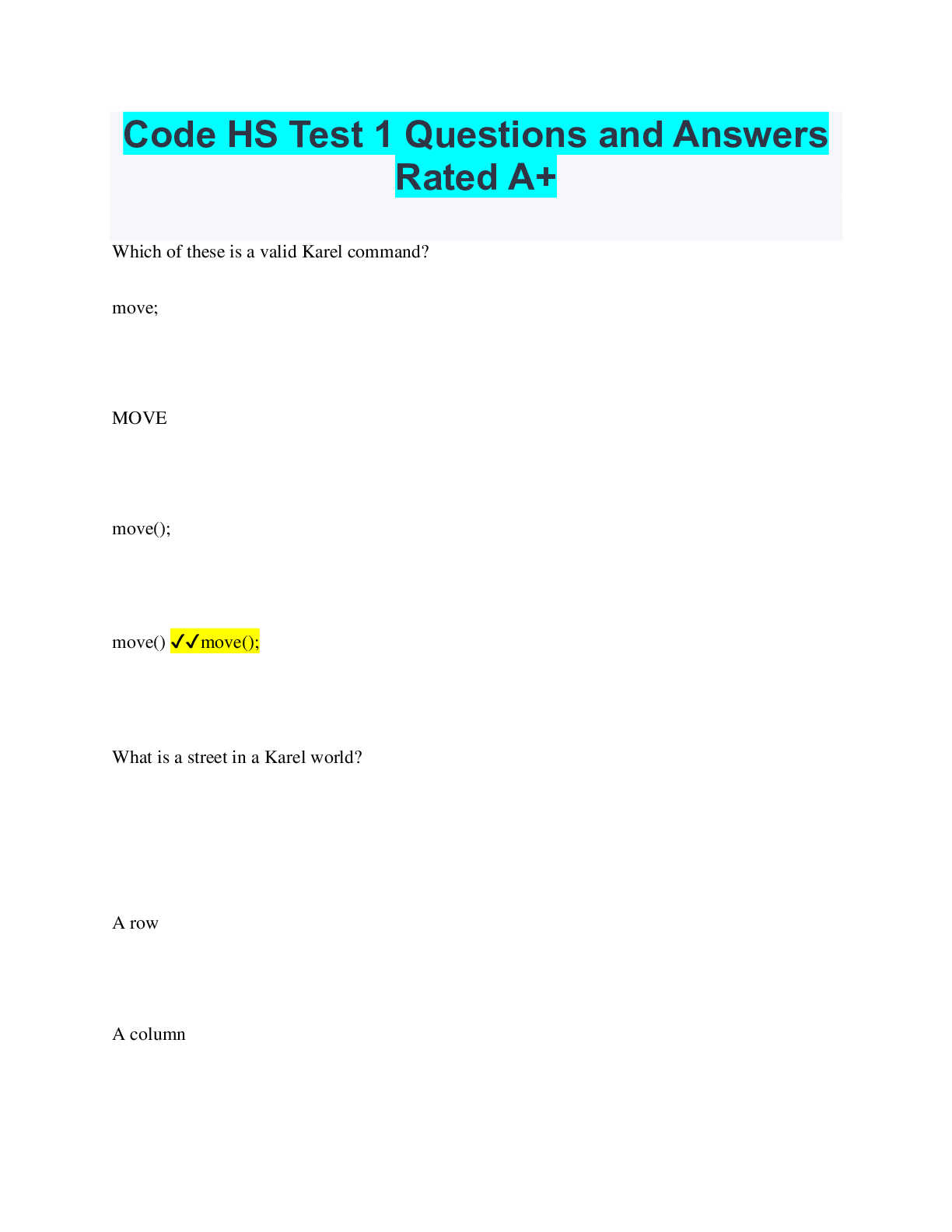 Code HS Test 1 Questions and Answers Rated A+ Which of these is a valid Karel command? move; MOVE move(); move() ✔✔move(); What is a street in a Karel world? A row A column A single point K...