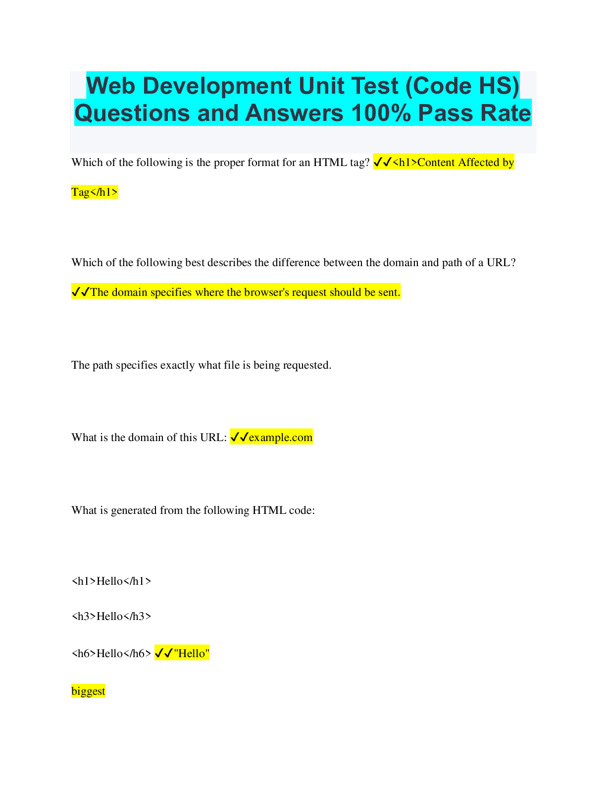 Web Development Unit Test (Code HS) Questions and Answers 100% Pass Rate Which of the following is the proper format for an HTML tag? ✔✔<h1>Content Affected by Tag</h1> Which of the following best...