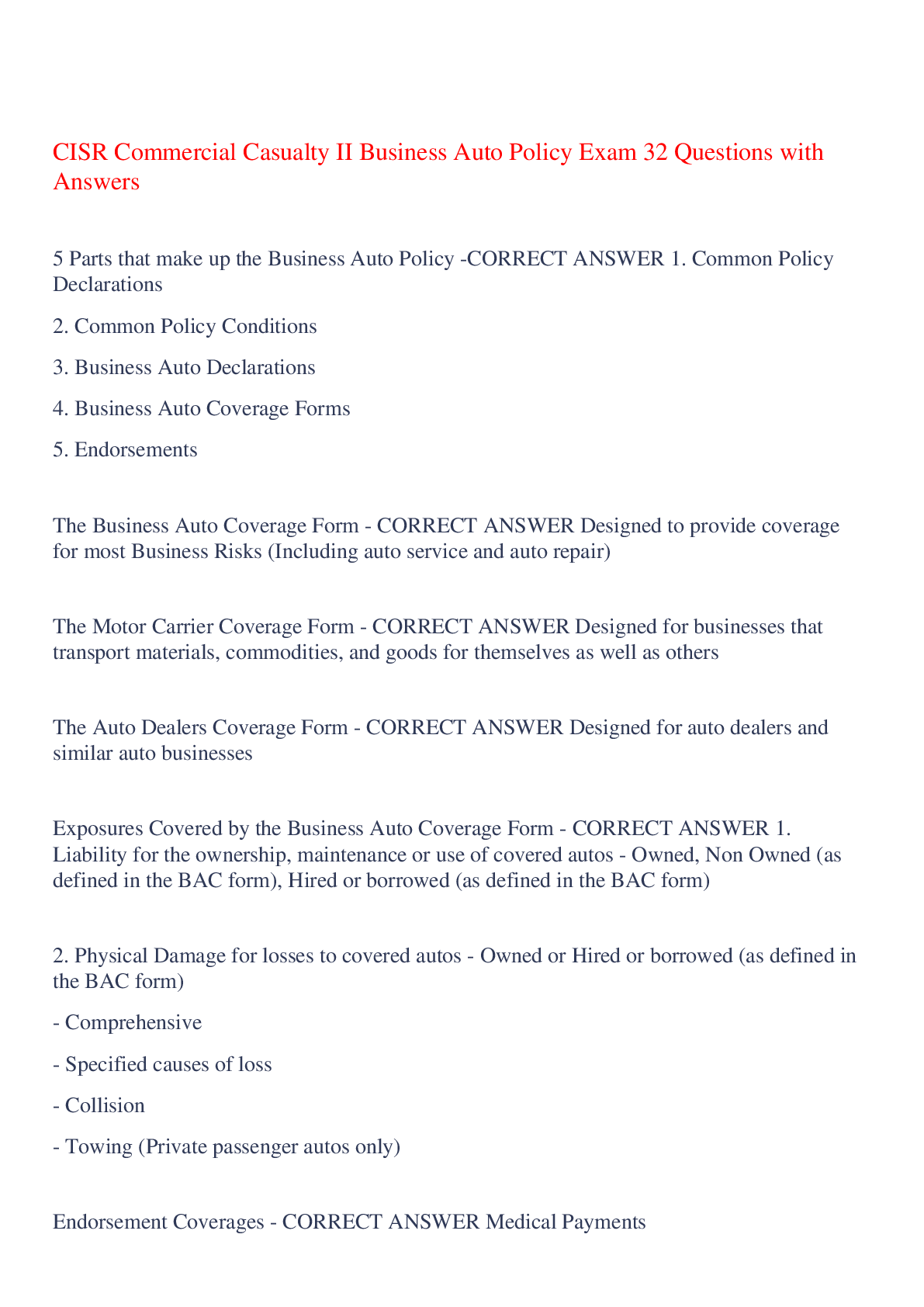 CISR Commercial Casualty II Business Auto Policy Exam 32 Questions with Answers 5 Parts that make up the Business Auto Policy -CORRECT ANSWER 1. Common Policy Declarations 2. Common Policy Conditi...