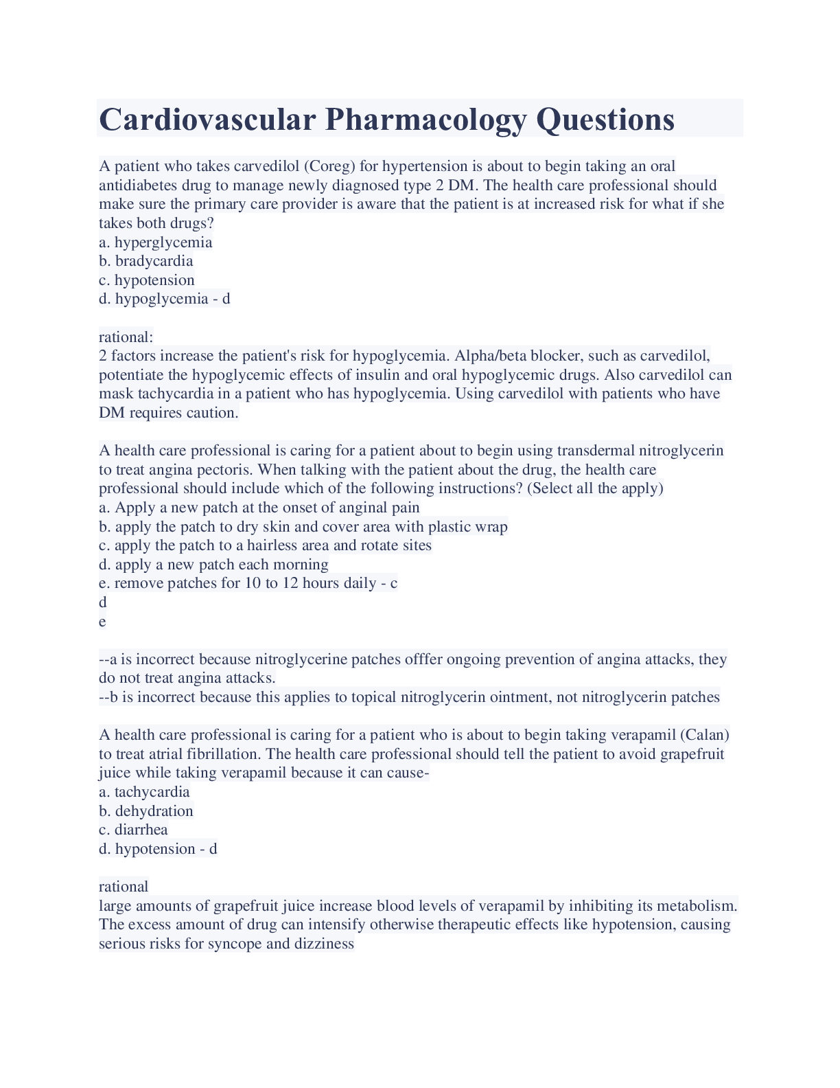 Pharmacology> EXAM > Cardiovascular Pharmacology Questions And Answers (All)
