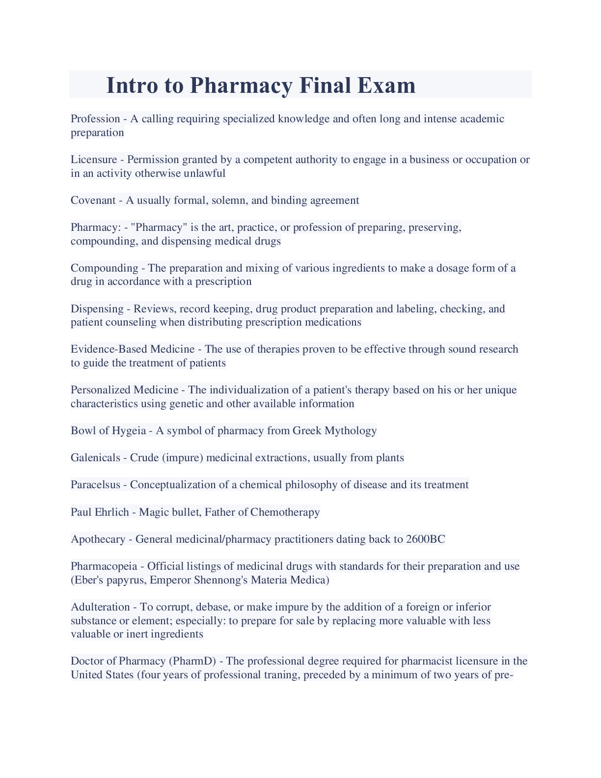 Intro to Pharmacy Final Exam latest Updates
