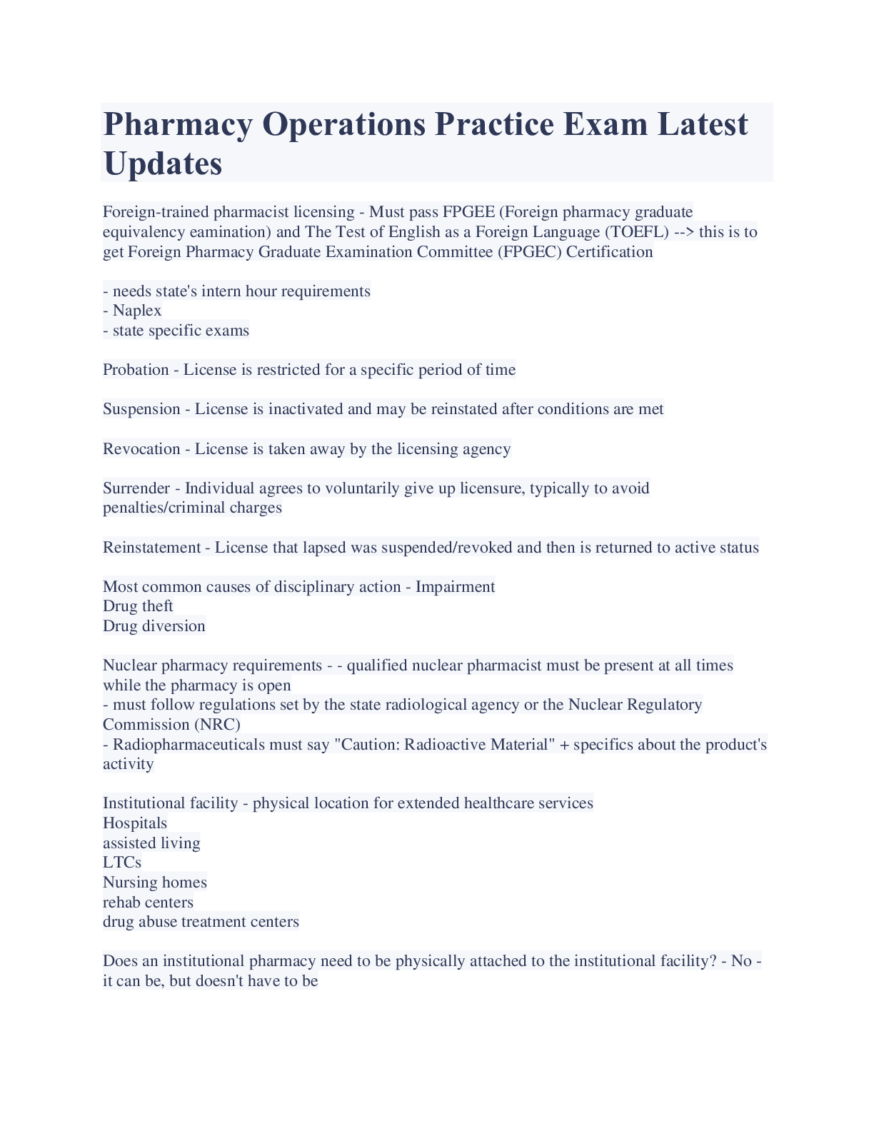 Health Care> EXAM > Pharmacy Operations Practice Exam Latest Updates (All)