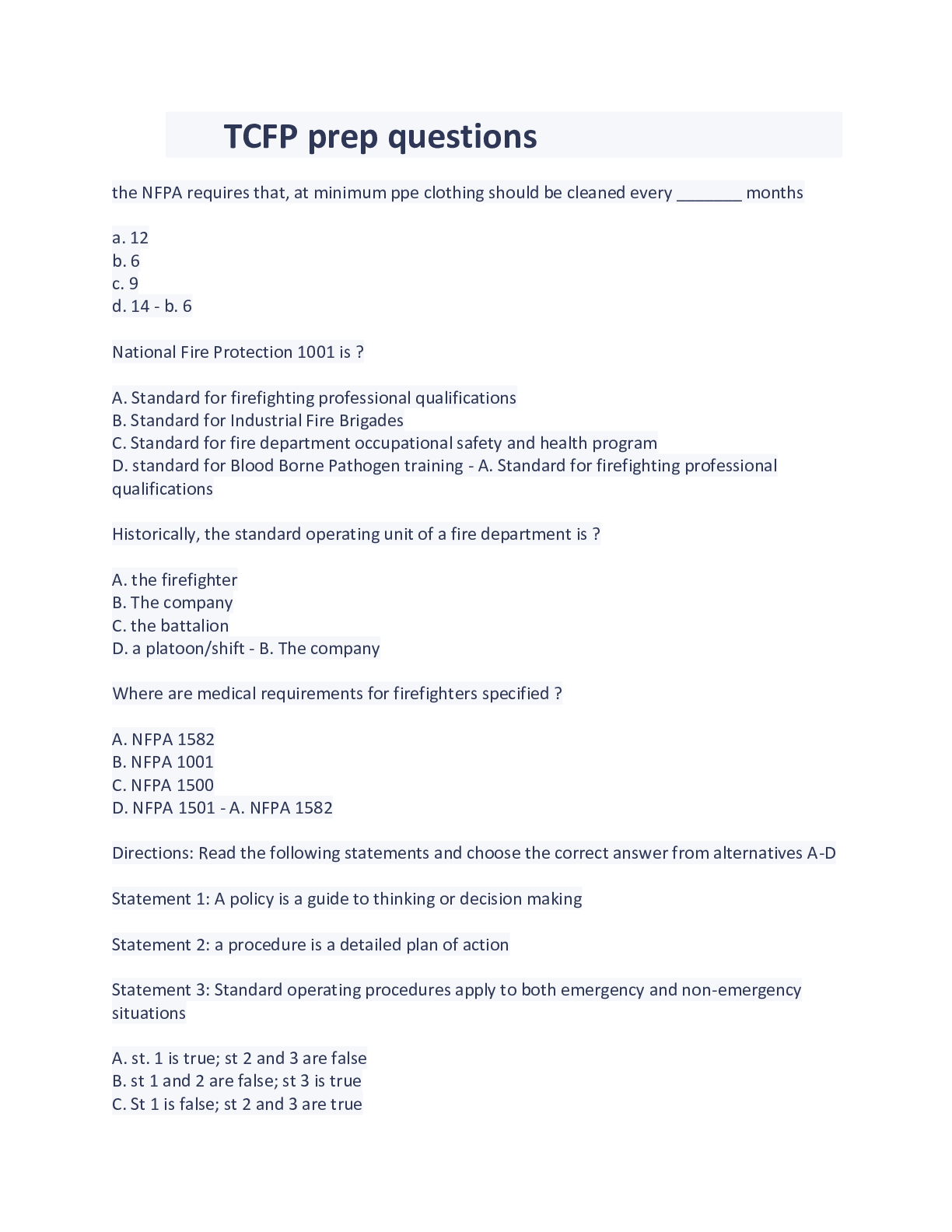 TCFP prep questions and Answers Actual Test