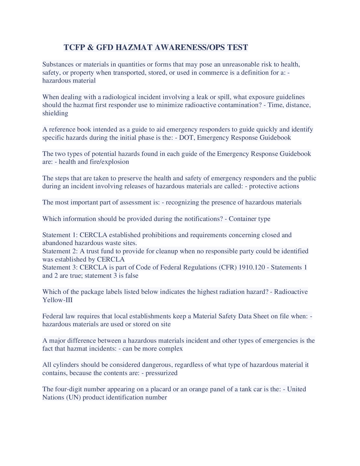 TCFP & GFD HAZMAT AWARENESS/OPS TEST VERIFIED 100%