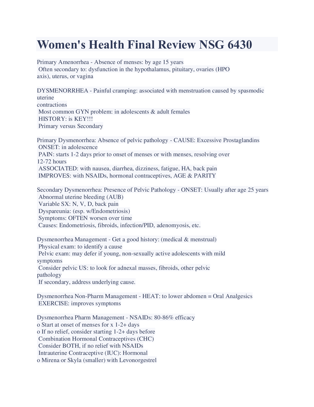 Health Care> EXAM > Women's Health Final Review NSG 6430 Latest Updates (All)
