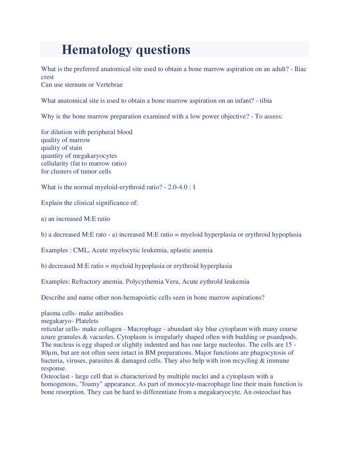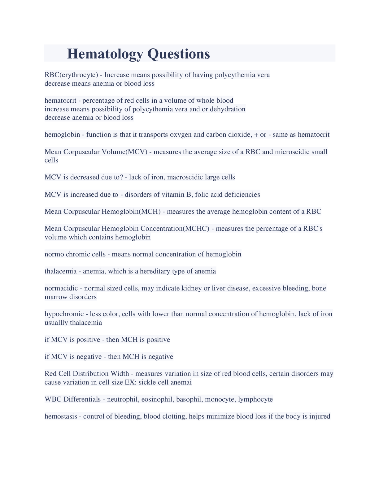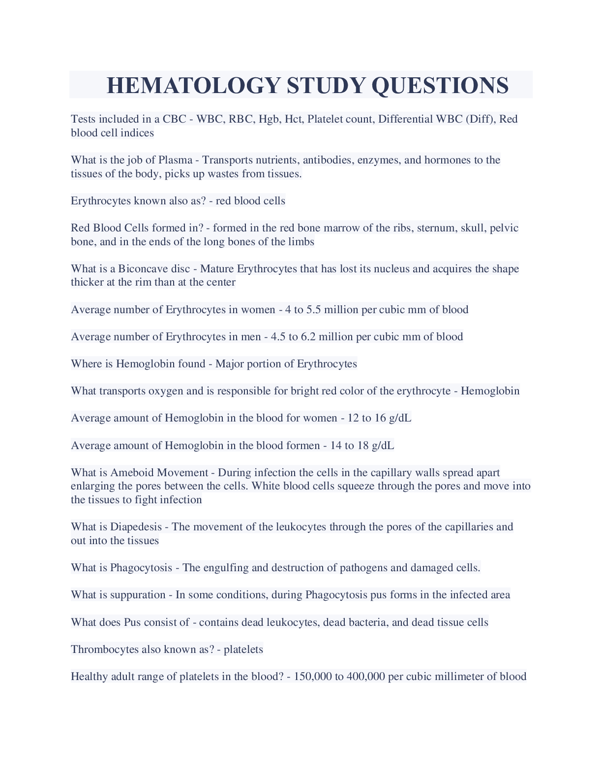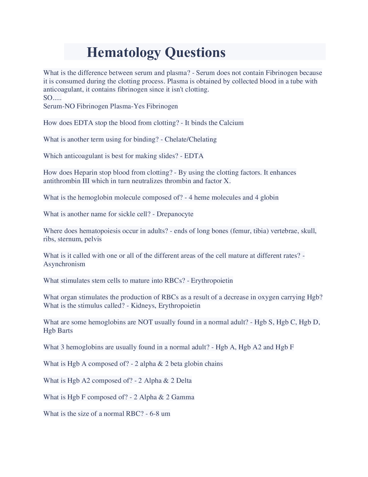 HEMATOLOGY STUDY QUESTIONS AND ANSWERS