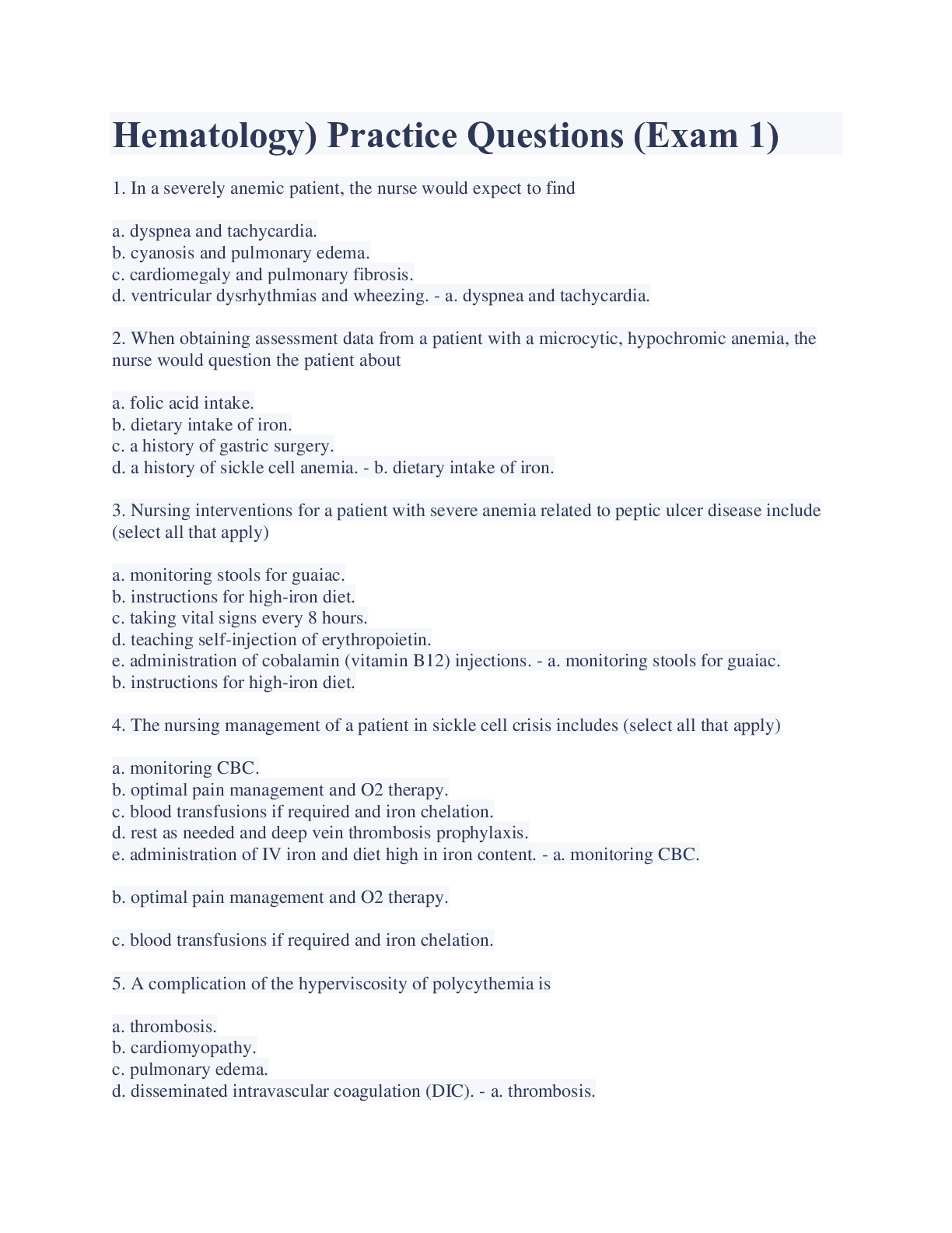 Hematology) Practice Questions (Exam 1) Latest