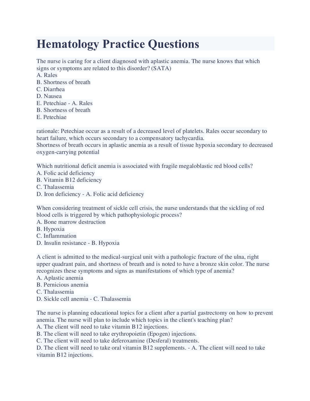 Health Care> EXAM > Hematology Practice Questions And Answers 2023 (All)