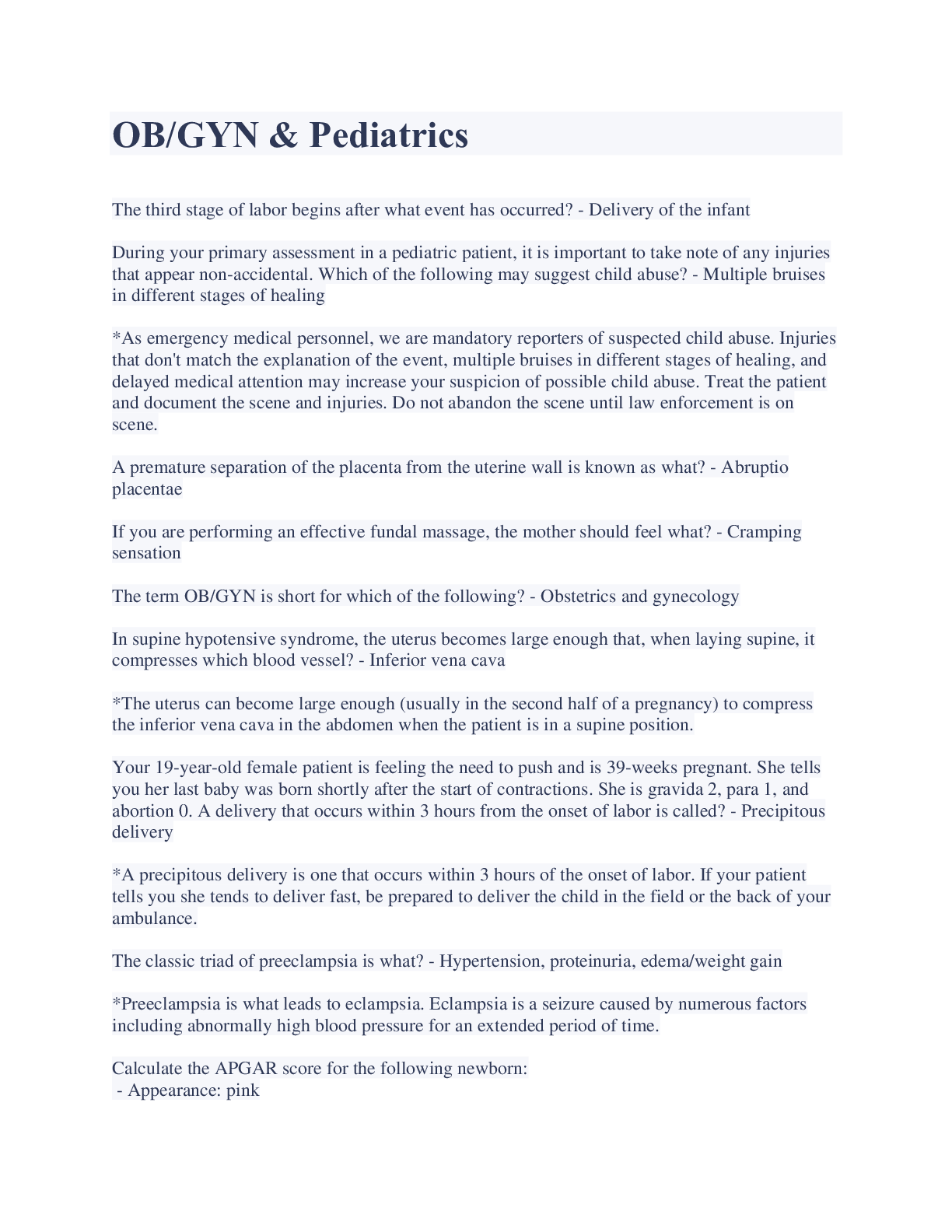 Health Care> EXAM > OB/GYN and Pediatric Questions and Answers 2023 (All)