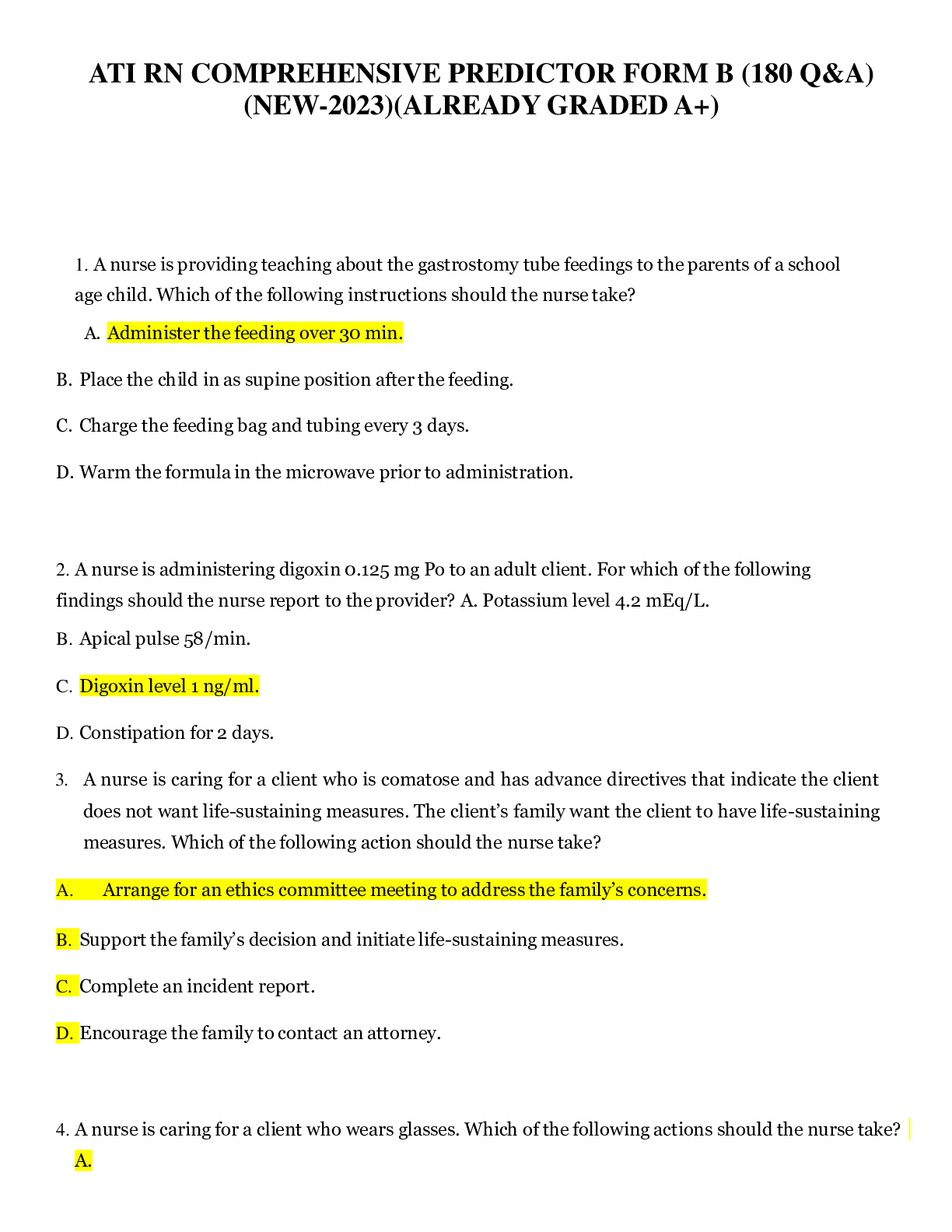ATI RN COMPREHENSIVE PREDICTOR FORM B (180 Q&A) (NEW-2023)(ALREADY GRADED A+)