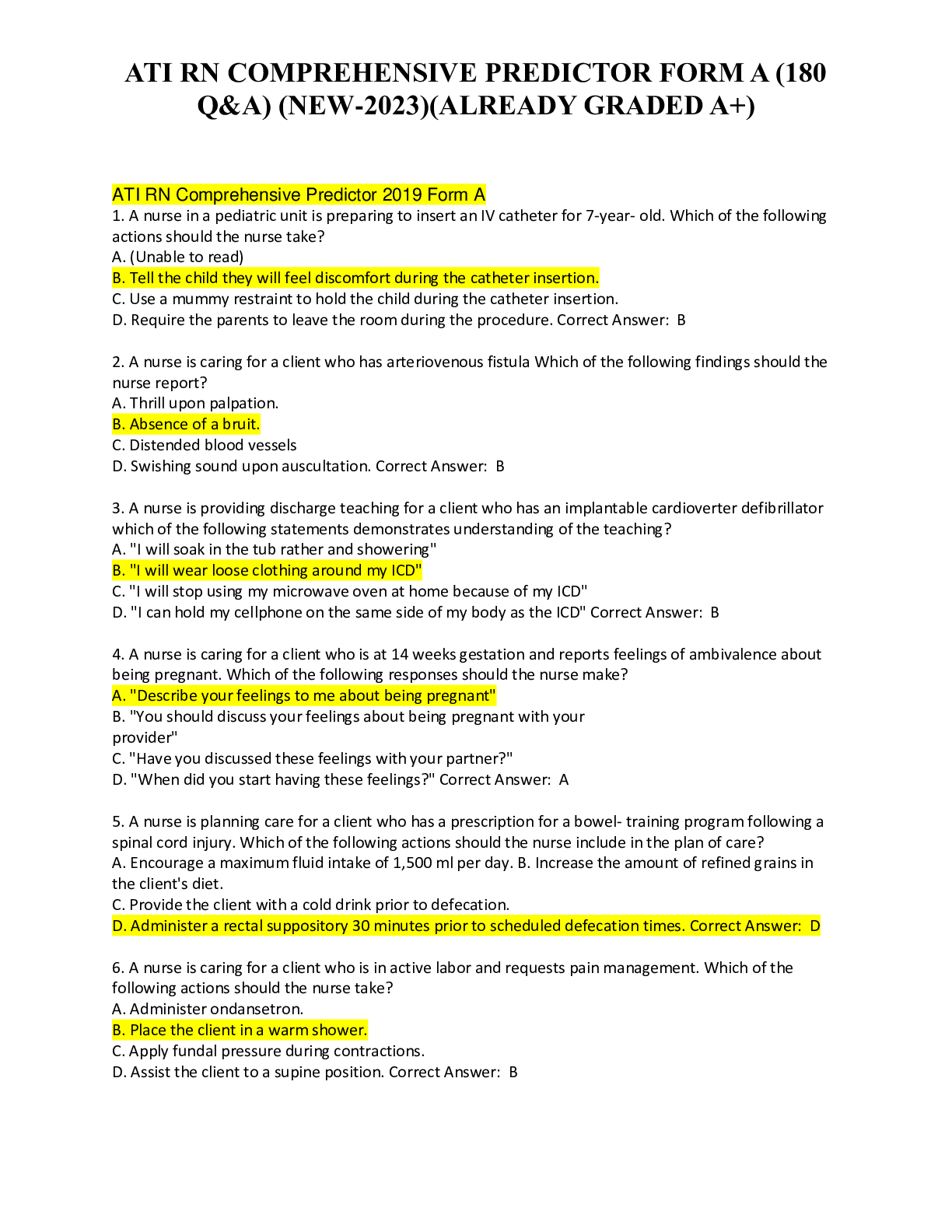 ATI RN COMPREHENSIVE PREDICTOR FORM A (180 Q&A) (NEW-2023)(ALREADY GRADED A+)