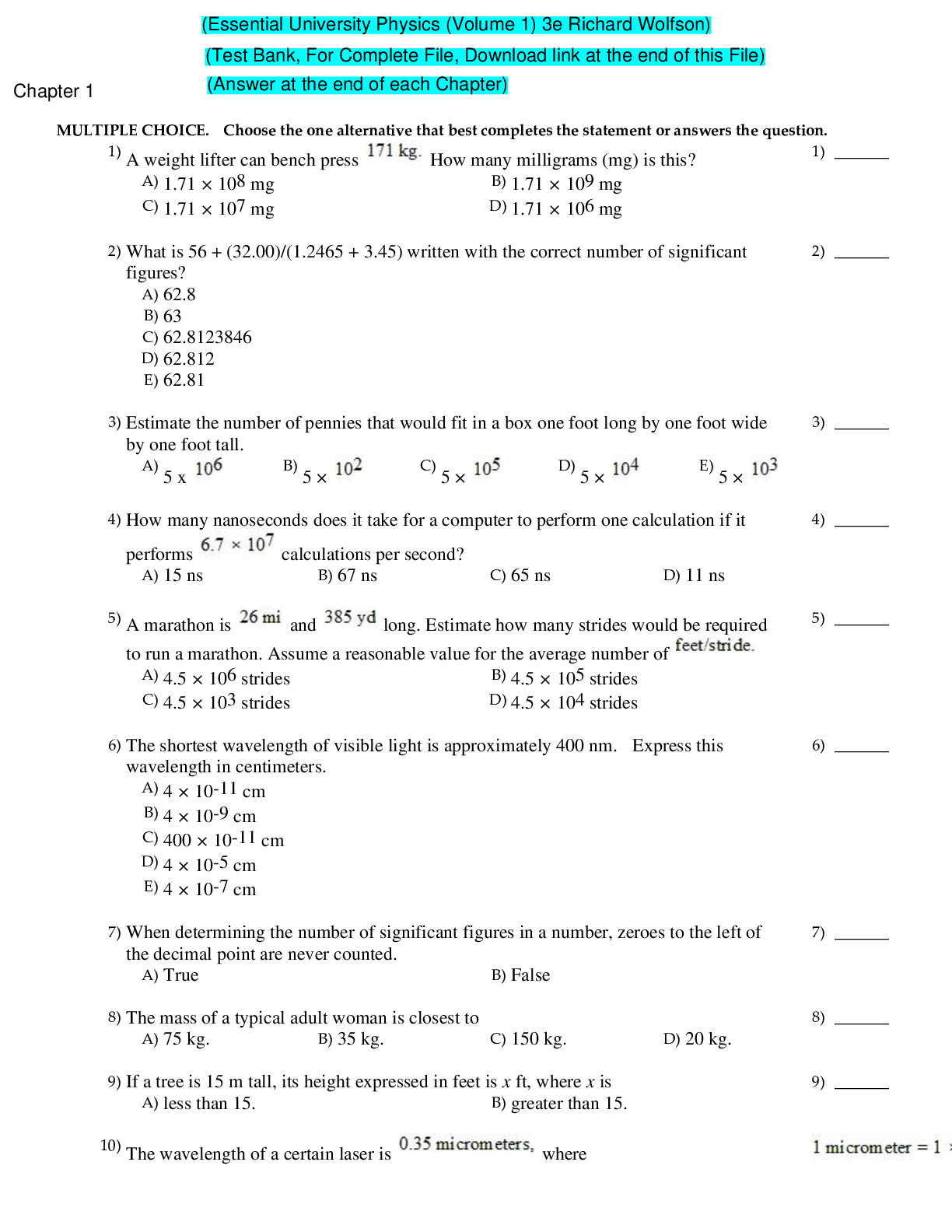 Physics> TEST BANKS > Essential University Physics (Volume 1) 3e Richard Wolfson (Test Bank) (All)