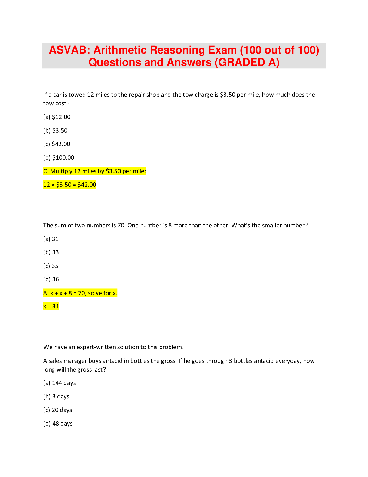 ASVAB: Arithmetic Reasoning Exam (100 out of 100) Questions and Answers (GRADED A)