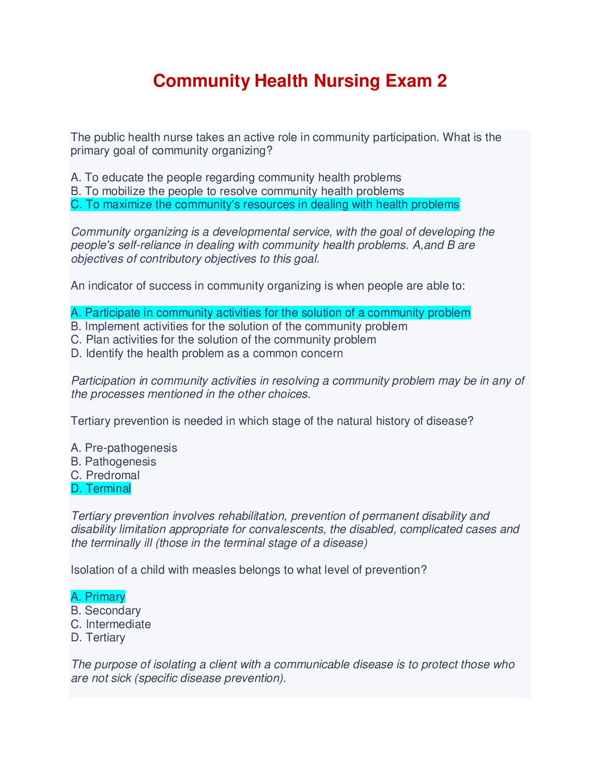 Community Health Nursing Exam 2 - Questions, Answers and Explanations The public health nurse takes an active role in community participation. What is the primary goal of community organizing? A. To...