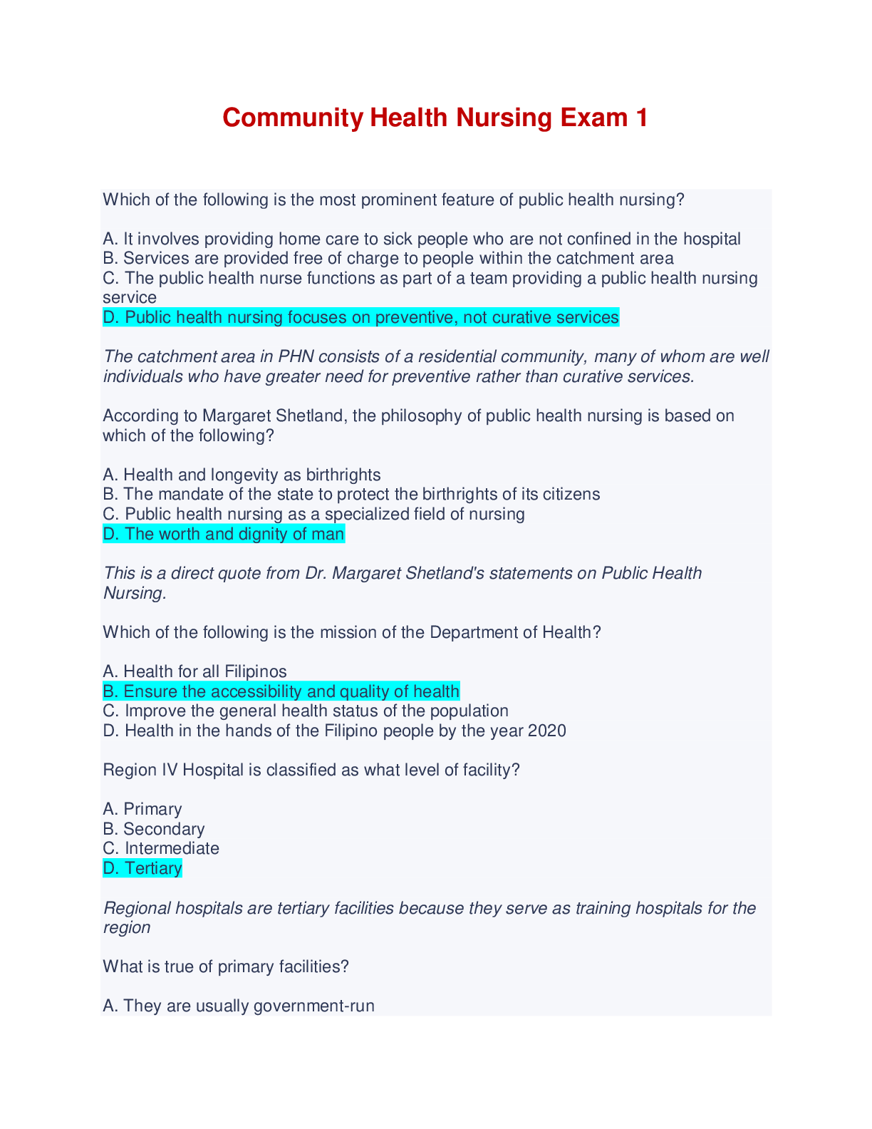 Health Care> EXAM > Community Health Nursing Exam 1 - Questions, Answers and Explanations (All)