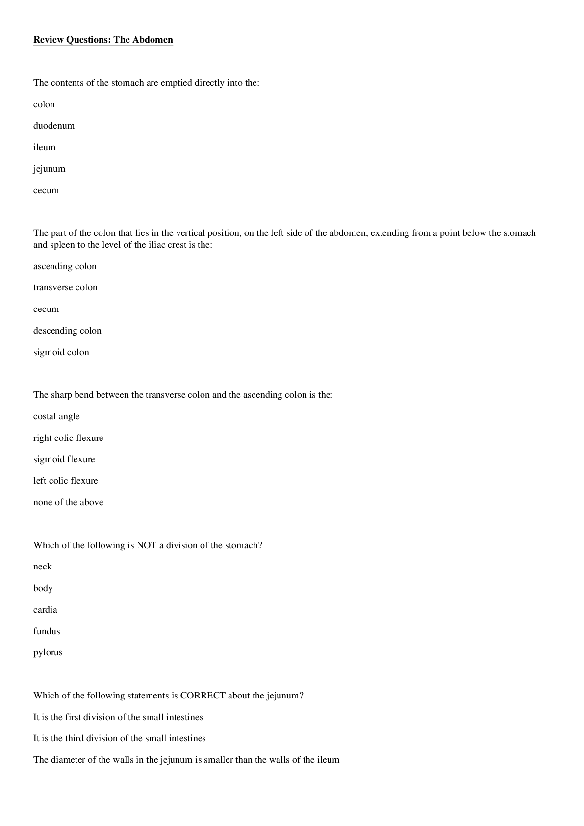 1. The contents of the stomach are emptied directly into the: A. colon B. duodenum C. ileum D. jejunum E. cecum 2. The part of the colon that lies in the vertical position, on the left side of...