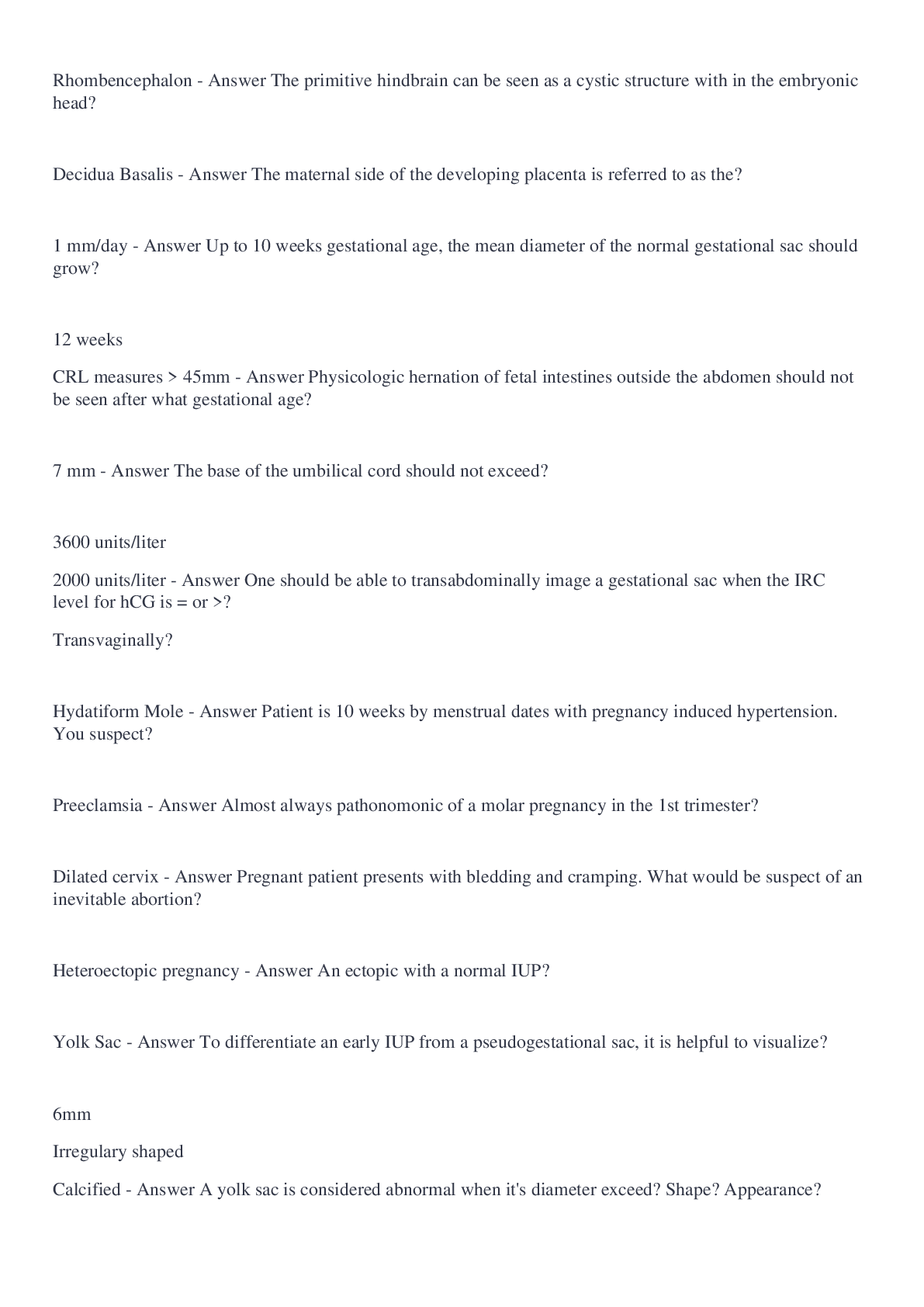 Rhombencephalon - Answer The primitive hindbrain can be seen as a cystic structure with in the embryonic head? Decidua Basalis - Answer The maternal side of the developing placenta is referred to a...