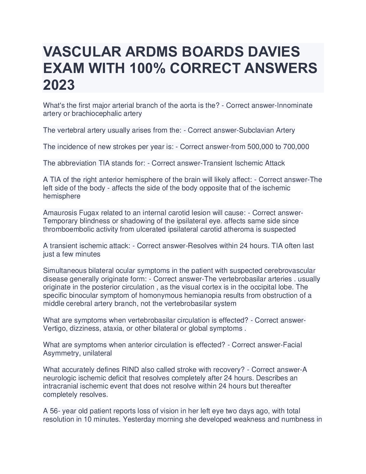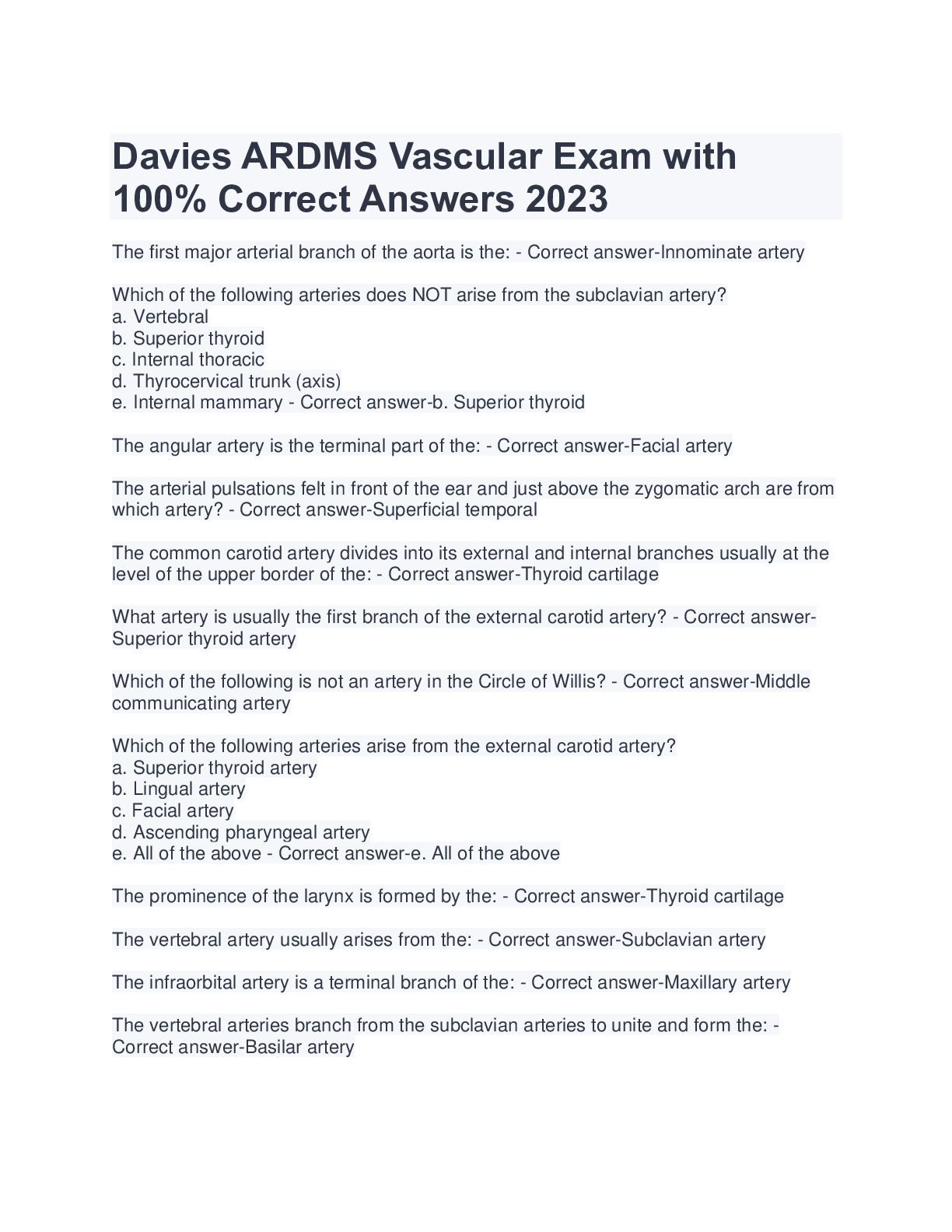 VASCULAR ARDMS BOARDS DAVIES EXAM WITH 100% CORRECT ANSWERS 2023 What's the first major arterial branch of the aorta is the? - Correct answer-Innominate artery or brachiocephalic artery The verte...