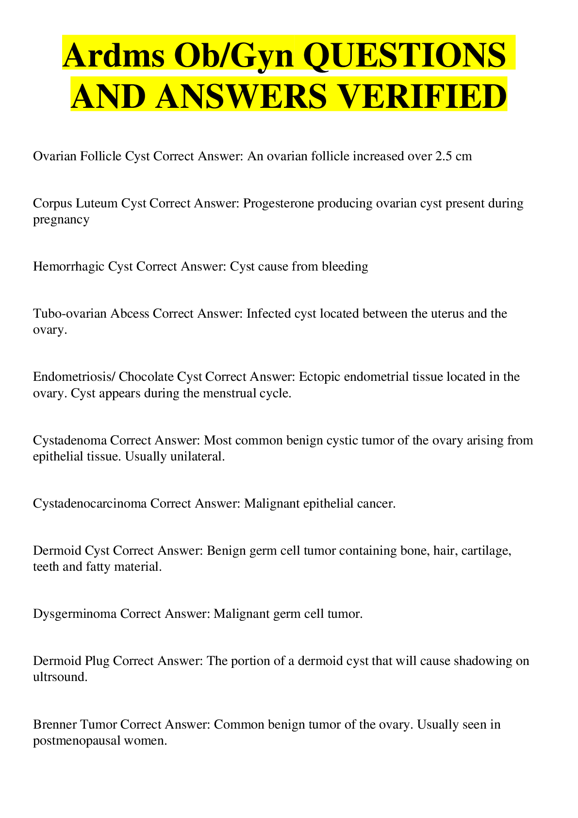 Ardms Ob/Gyn QUESTIONS AND ANSWERS VERIFIED