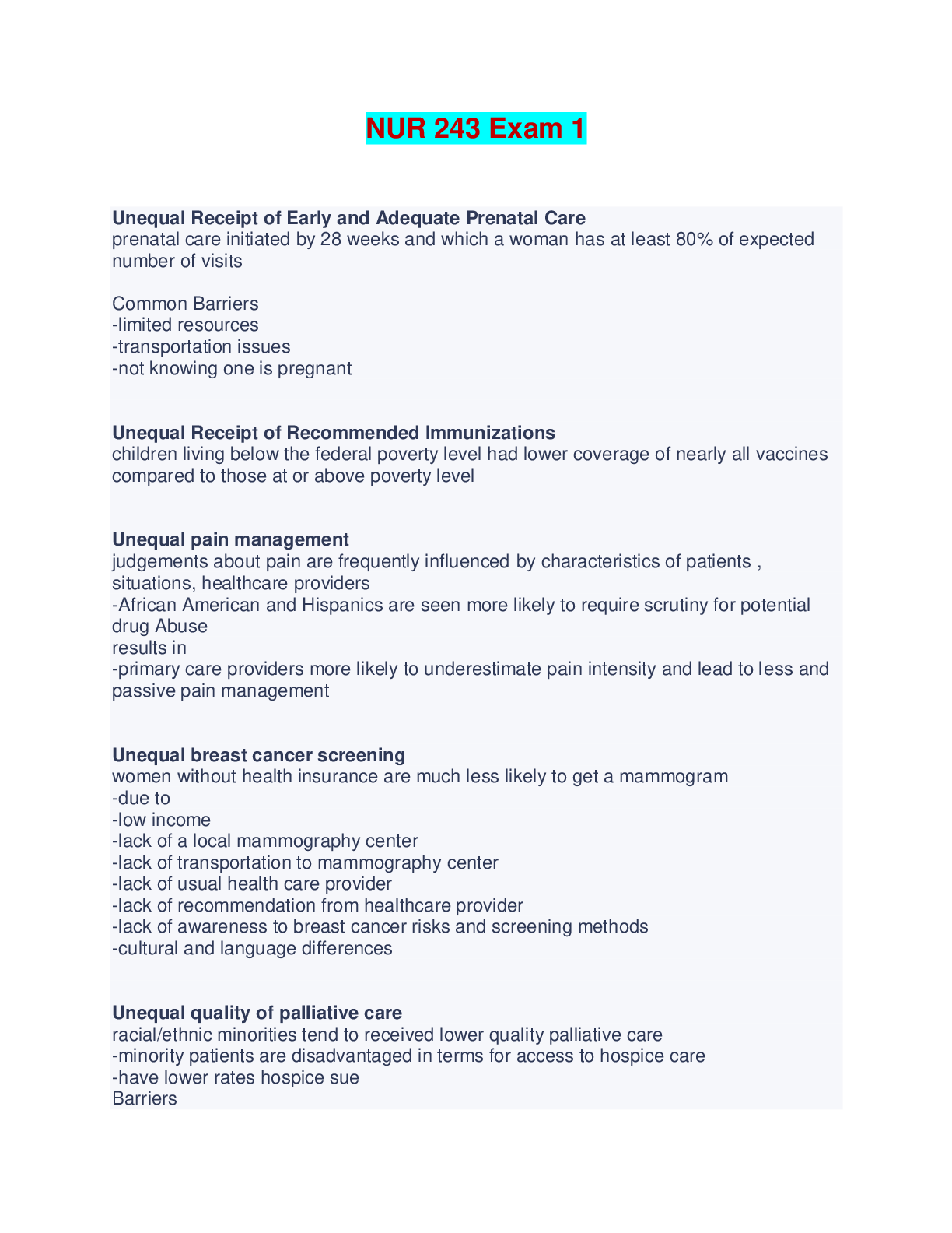 NUR 243 Exam 1 - Questions and Answers Unequal Receipt of Early and Adequate Prenatal Care prenatal care initiated by 28 weeks and which a woman has at least 80% of expected number of visits Common B...