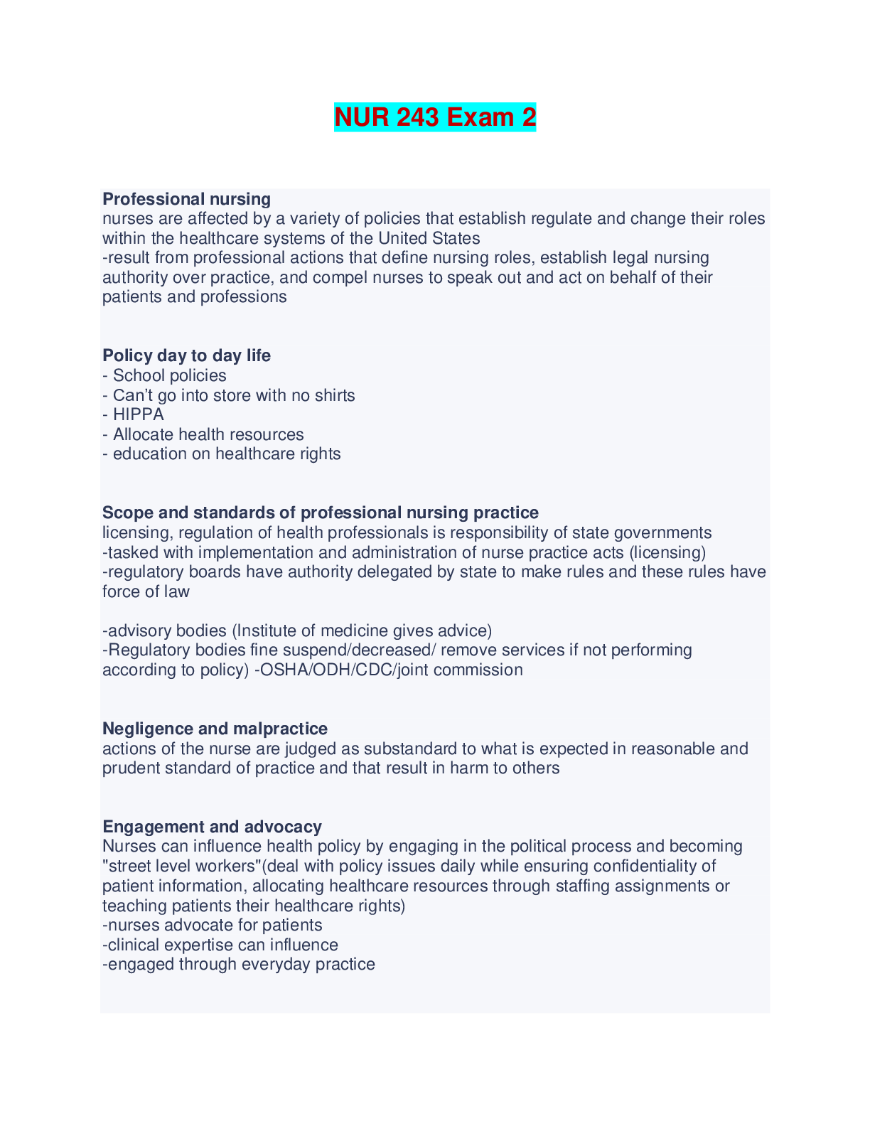 NUR 243 Exam 2 - Questions and Answers Professional nursing nurses are affected by a variety of policies that establish regulate and change their roles within the healthcare systems of the United Sta...