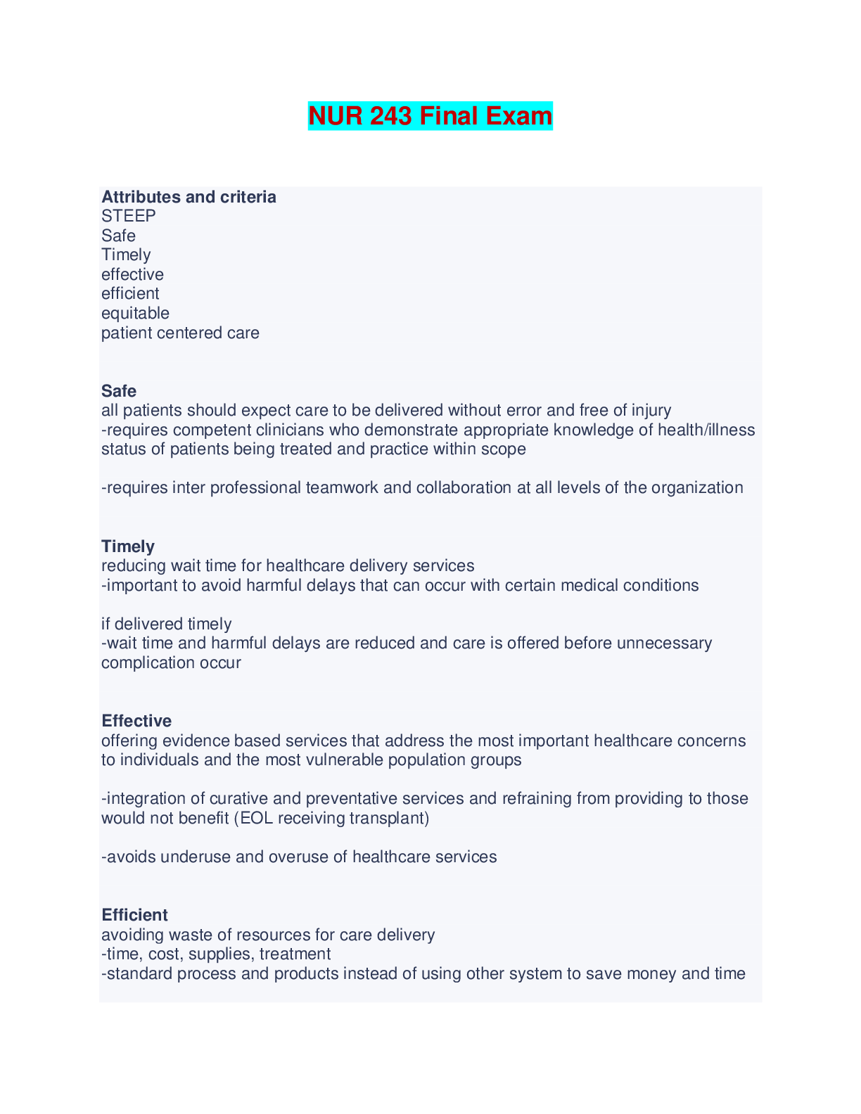 NUR 243 Final Exam - Questions and Answers Attributes and criteria STEEP Safe Timely effective efficient equitable patient centered care Safe all patients should expect care to be delivered without e...