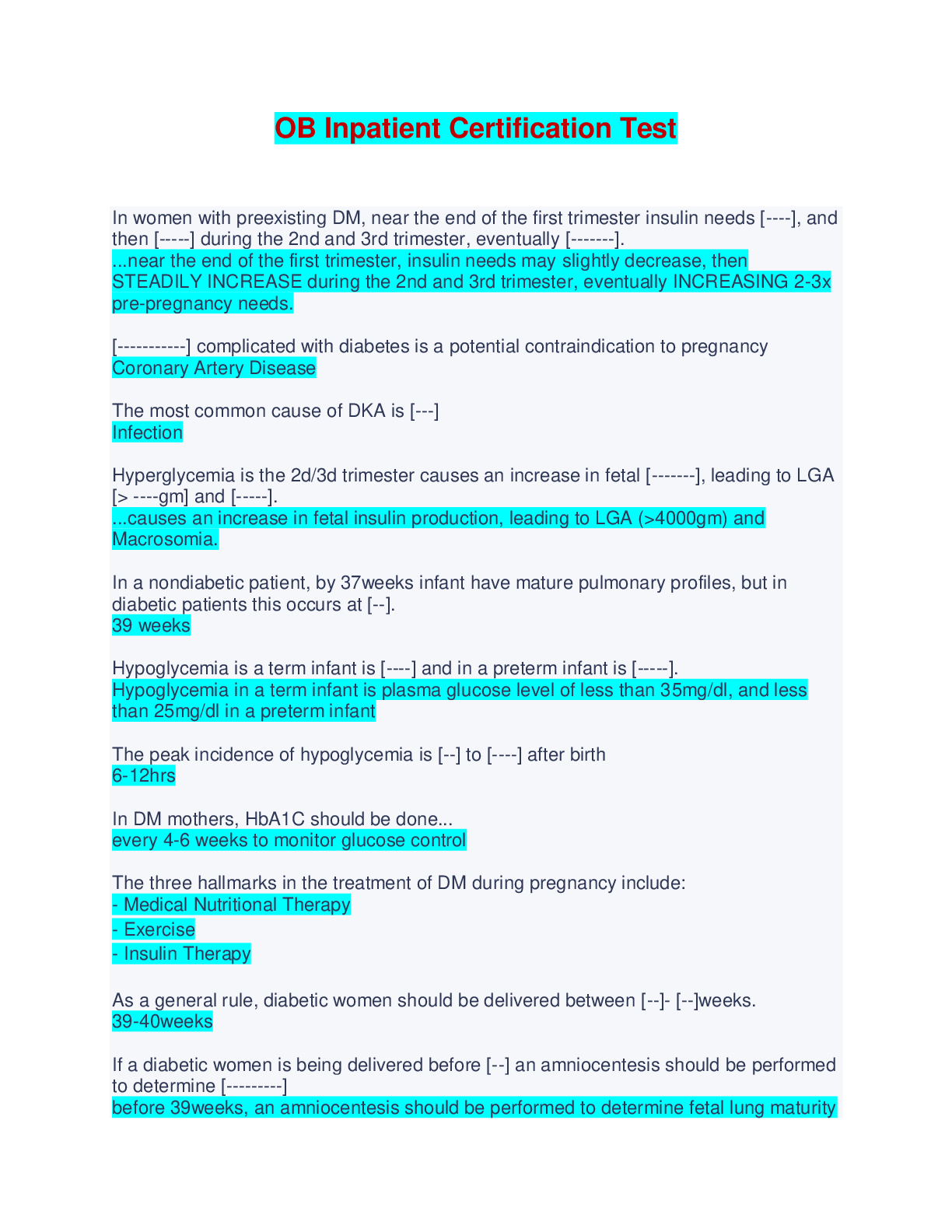 OB Inpatient Certification Test - Questions and Answers In women with preexisting DM, near the end of the first trimester insulin needs [----], and then [-----] during the 2nd and 3rd trimester, even...