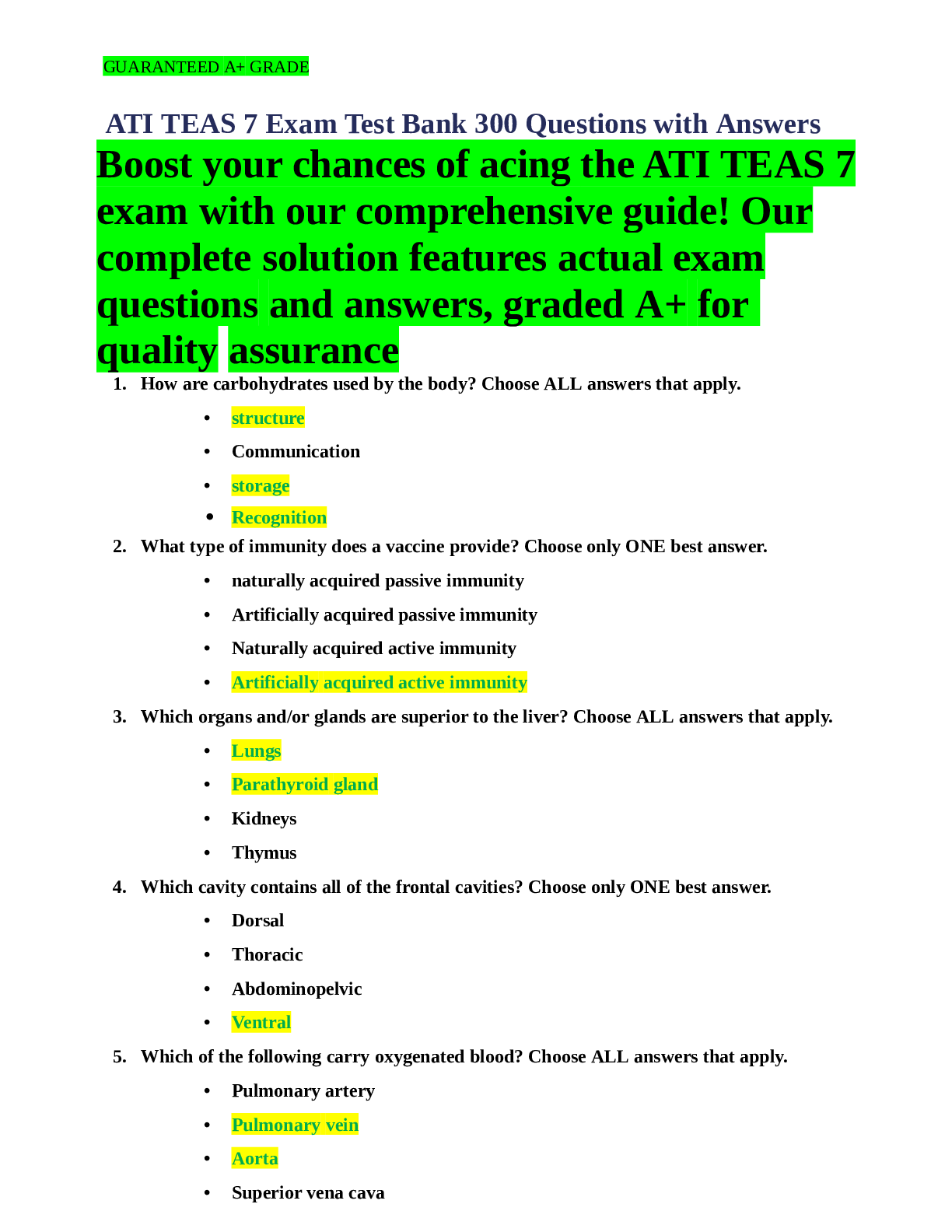 ATI TEAS 7 EXAM TEST BANK 300 qns and ans latest update for 2023-2024 stude