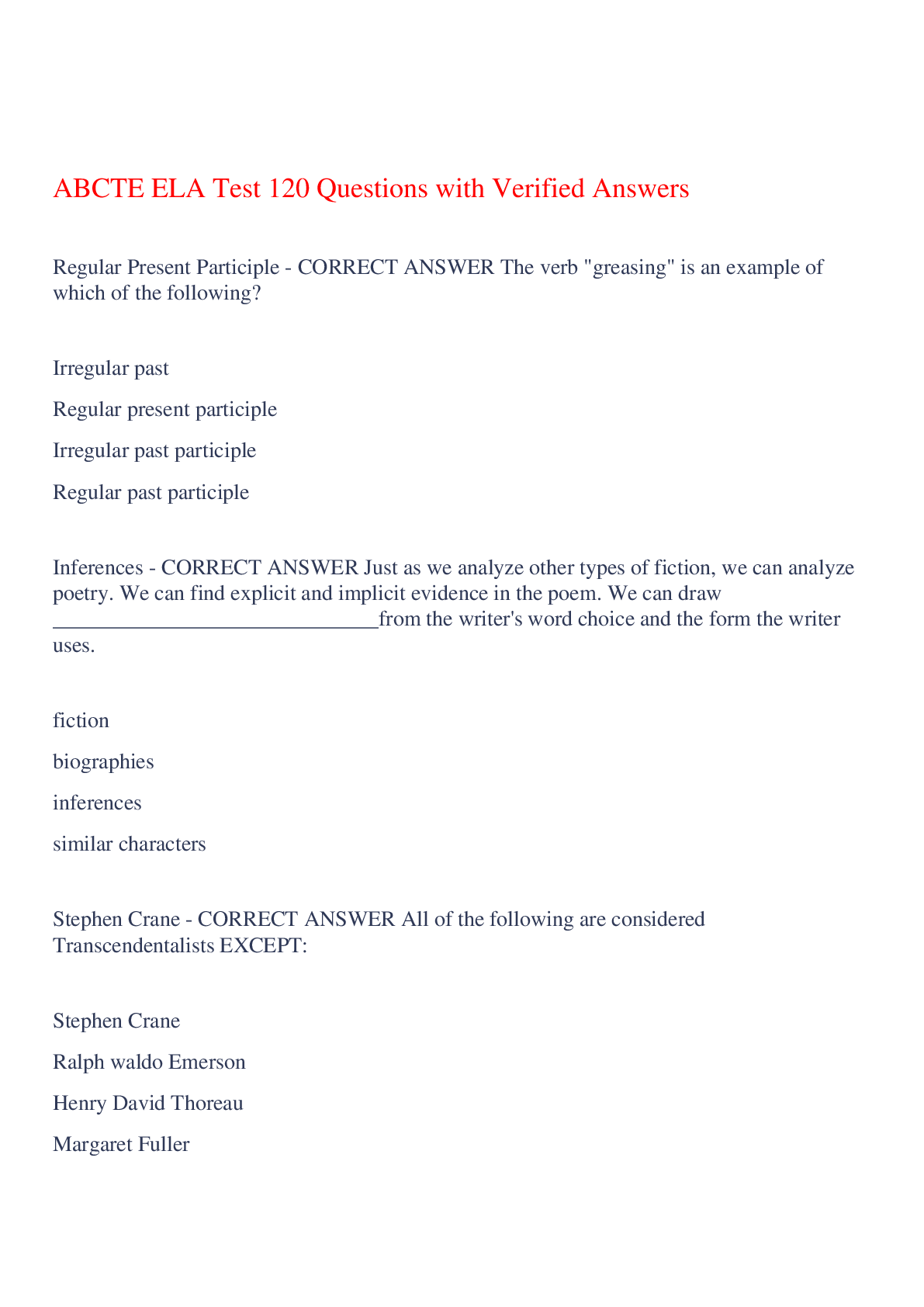 ABCTE ELA Test 120 Questions with Verified Answers Regular Present Participle - CORRECT ANSWER The verb "greasing" is an example of which of the following? Irregular past Regular present partic...