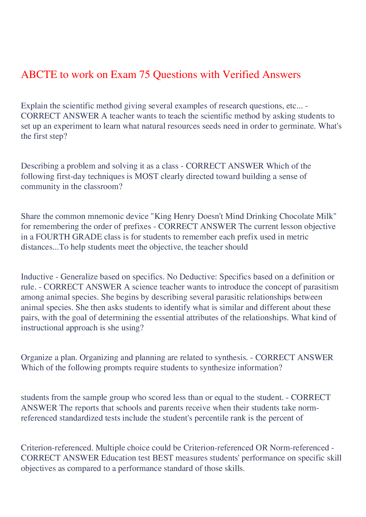 ABCTE to work on Exam 75 Questions with Verified Answers Explain the scientific method giving several examples of research questions, etc... - CORRECT ANSWER A teacher wants to teach the scientific...