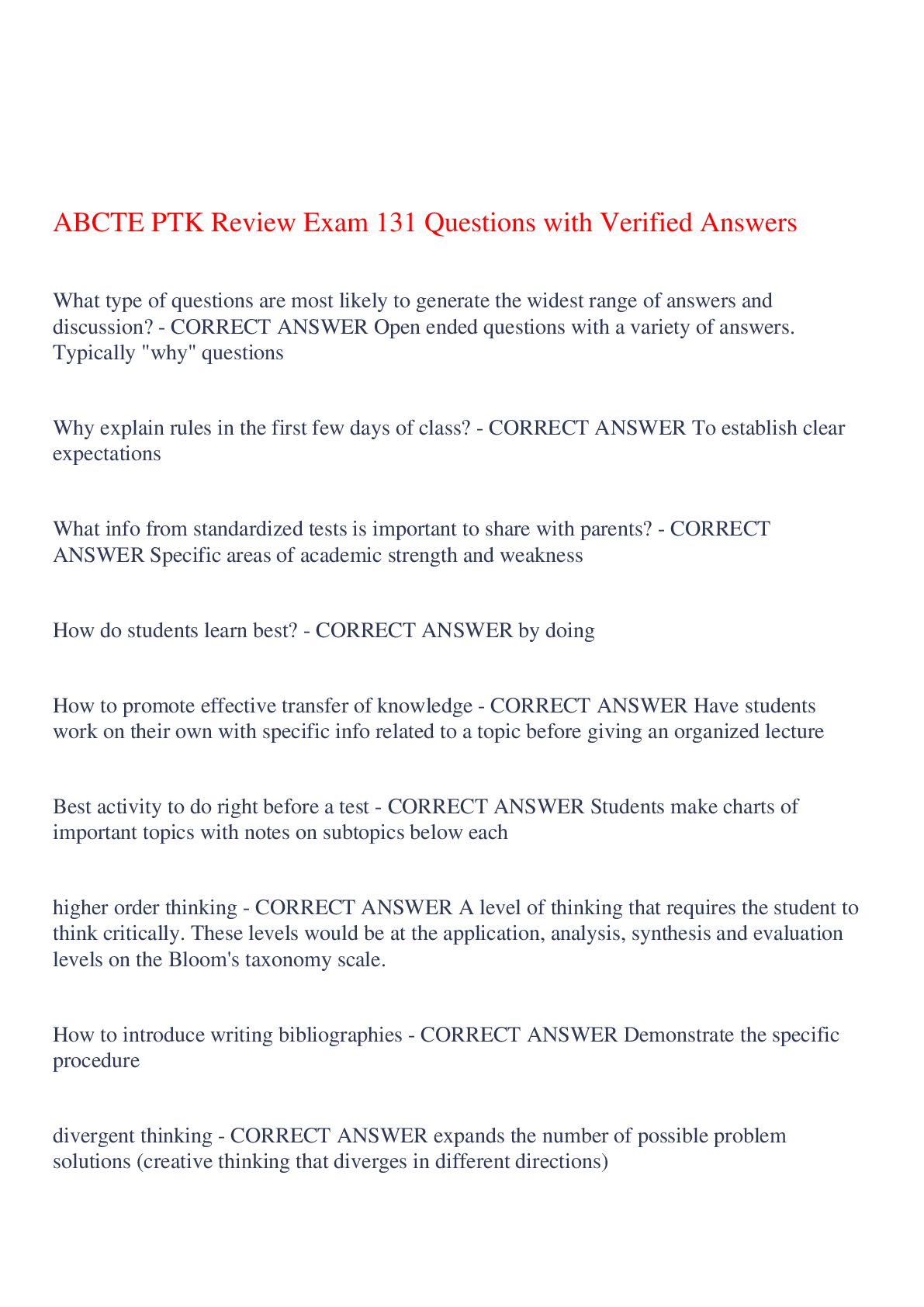 ABCTE PTK Review Exam 131 Questions with Verified Answers What type of questions are most likely to generate the widest range of answers and discussion? - CORRECT ANSWER Open ended questions with a...