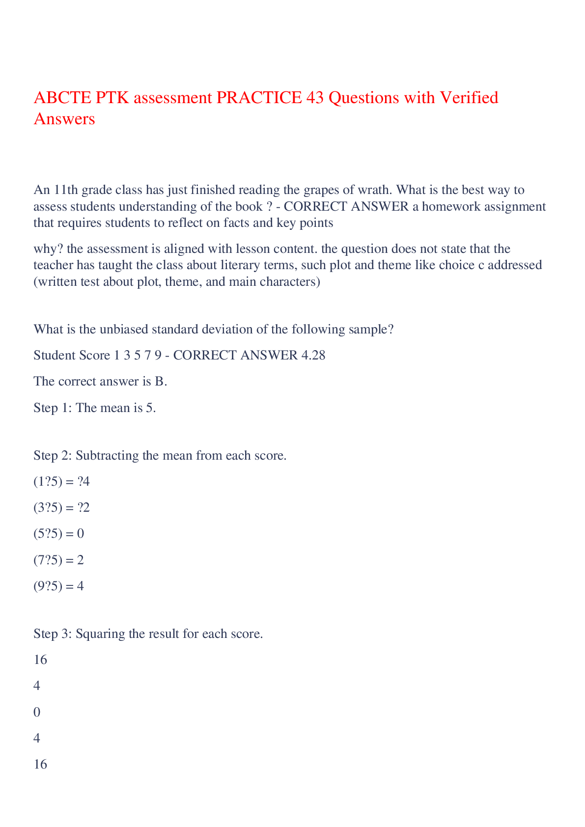 ABCTE PTK assessment PRACTICE 43 Questions with Verified Answers An 11th grade class has just finished reading the grapes of wrath. What is the best way to assess students understanding of the bo...